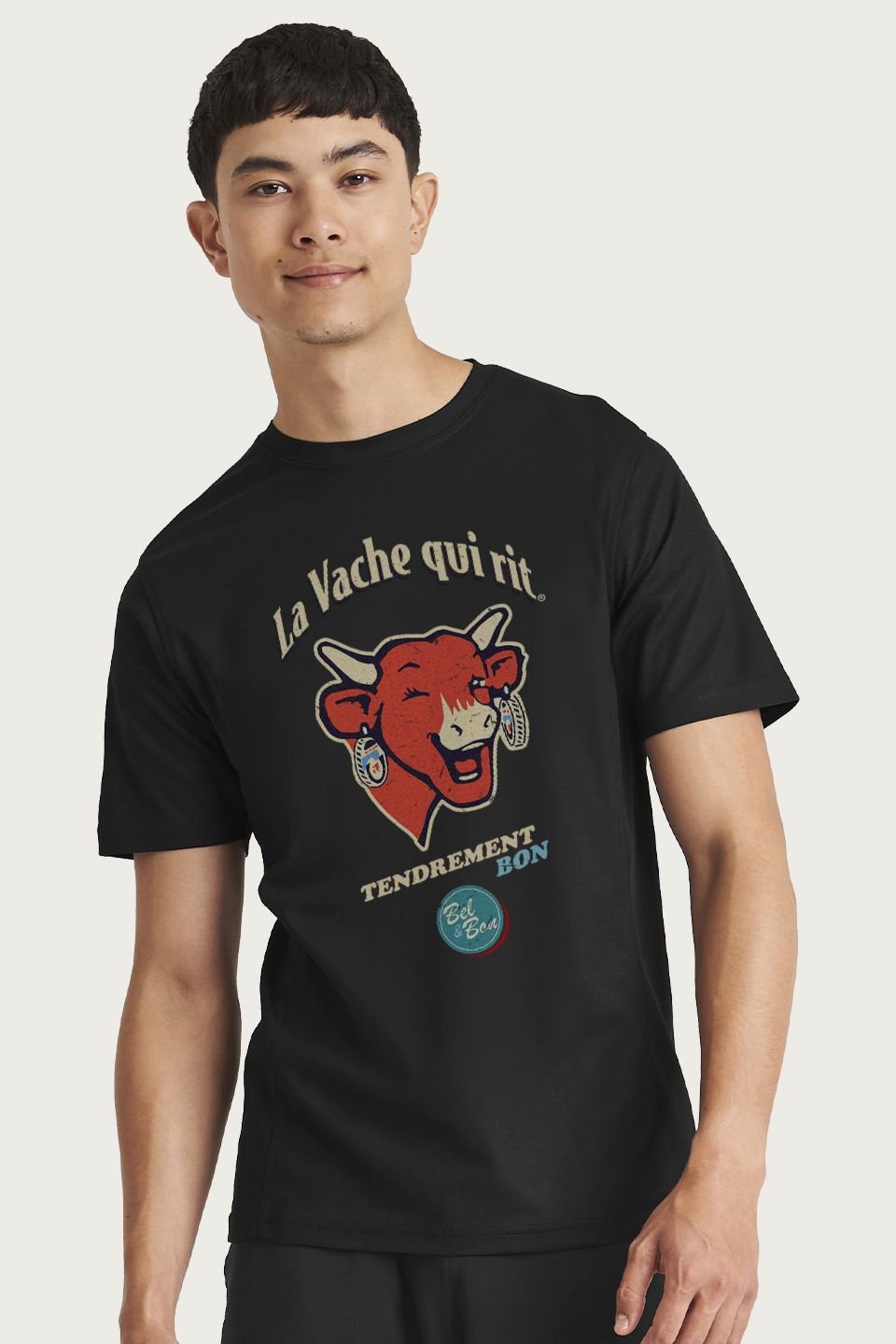 Officially licensed The Laughing Cow apparel. This black cotton t-shirt features a crew neck and a playful graphic print. Perfect for a casual, everyday look.