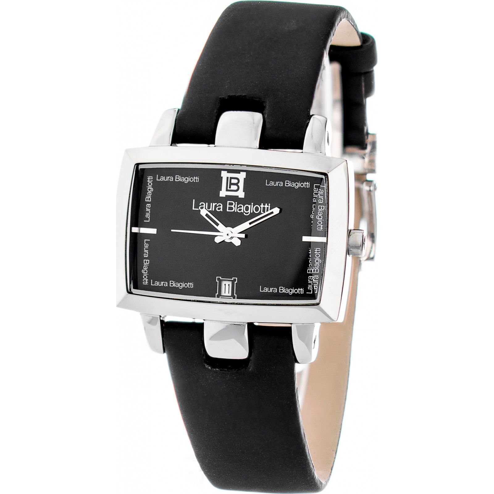 Stylish Laura Biagiotti men's watch with a black dial and black leather strap. Features a square case and silver-tone accents. Ideal for a classic and elegant look.