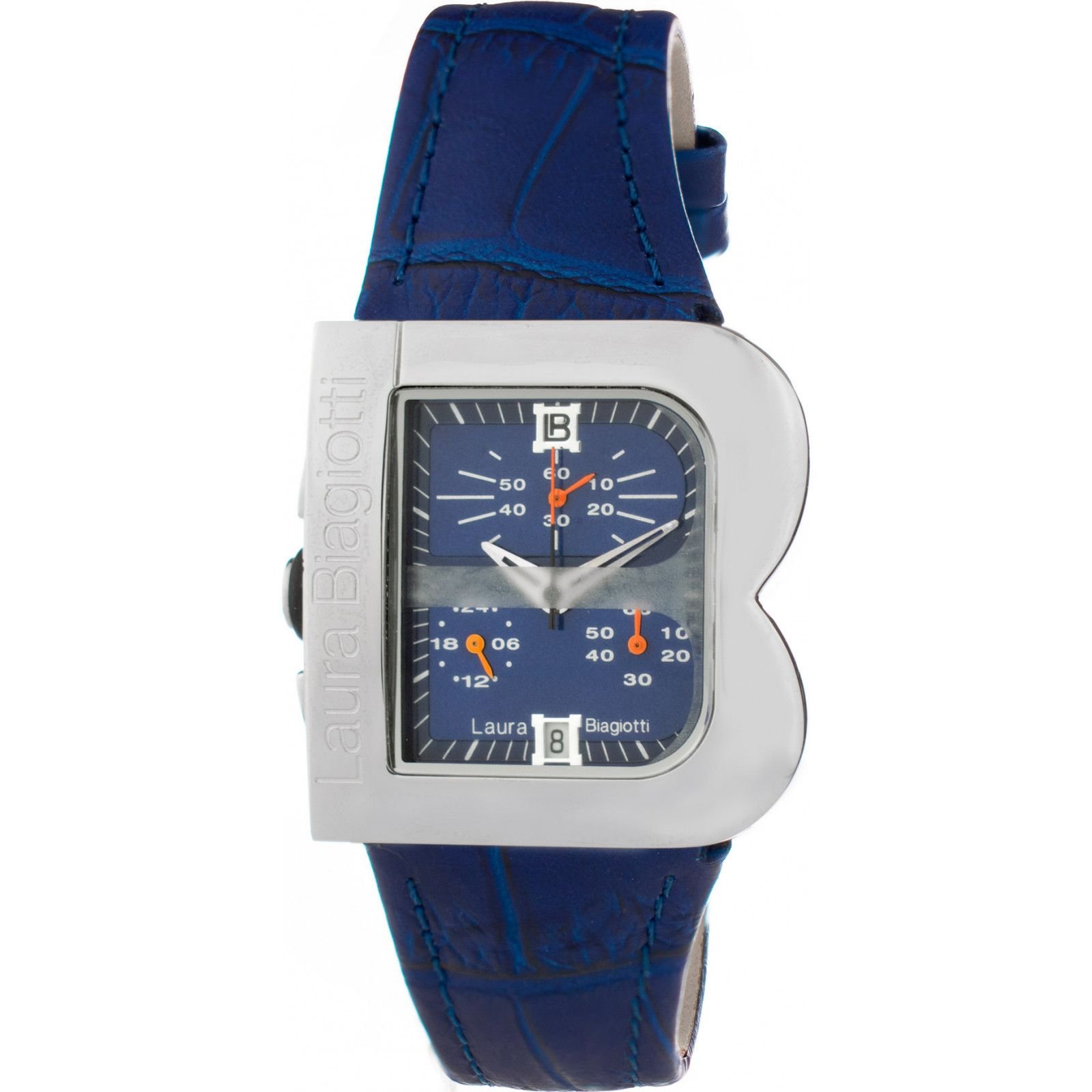 Stylish Laura Biagiotti watch with a blue dial and silver-tone case. Features a blue leather strap and quartz movement for precision. Ideal for everyday wear and special occasions.