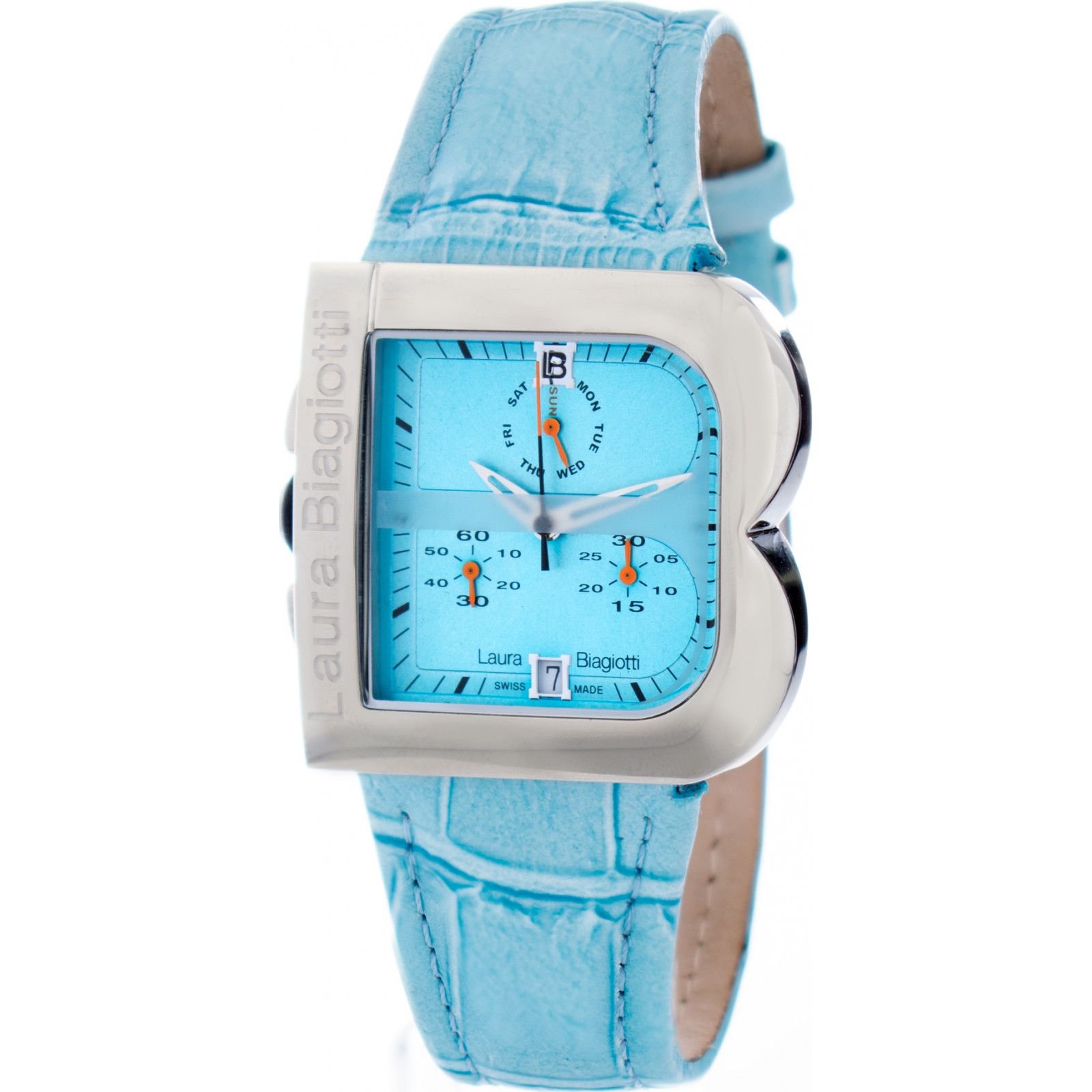 Stylish Laura Biagiotti watch with a blue leather strap and silver-tone case. Features a day-date display and quartz movement for precise timekeeping. Ideal for everyday wear or special occasions.