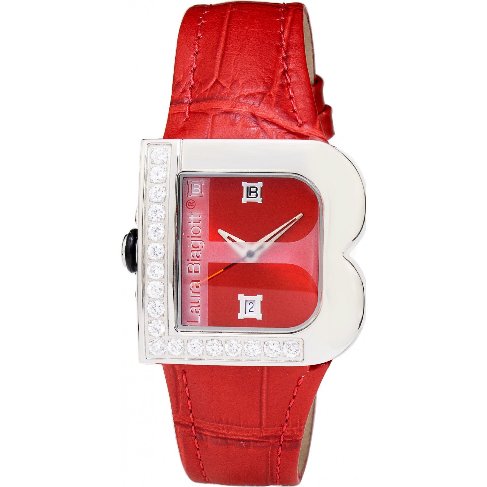 Elegant Laura Biagiotti watch featuring a red dial and silver accents. The watch has a square face with crystal embellishments and a red leather strap. Ideal for adding a touch of luxury to any outfit.