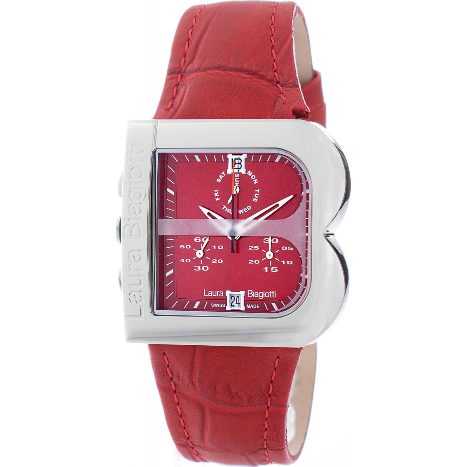 Stylish Laura Biagiotti ladies watch with a red dial and silver-tone case. Features a quartz movement and red leather strap for a bold, elegant look.
