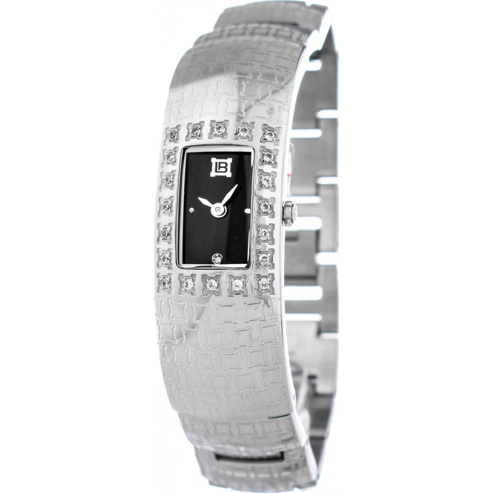 Elegant Laura Biagiotti watch featuring a rectangular dial adorned with crystal embellishments. The silver-tone metal band adds a touch of sophistication. Ideal for formal occasions or everyday wear.