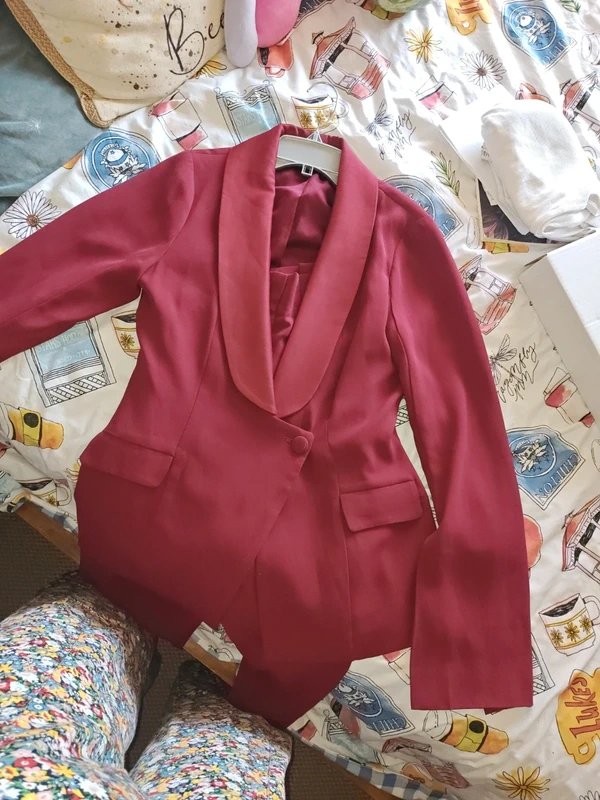 A beautiful burgundy suit with sleeve detail and a paper bag waist on the trousers. The tuxedo style detail on the blazer adds a touch of sophistication.