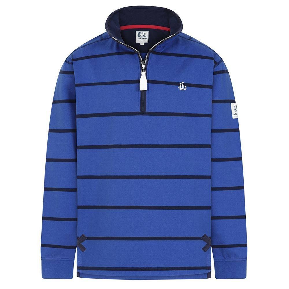 Stylish blue striped sweatshirt by Lazy Jacks. Made from 100% cotton, it features a standing collar, quarter zip fastening, and embroidered logo. Ideal for casual wear.
