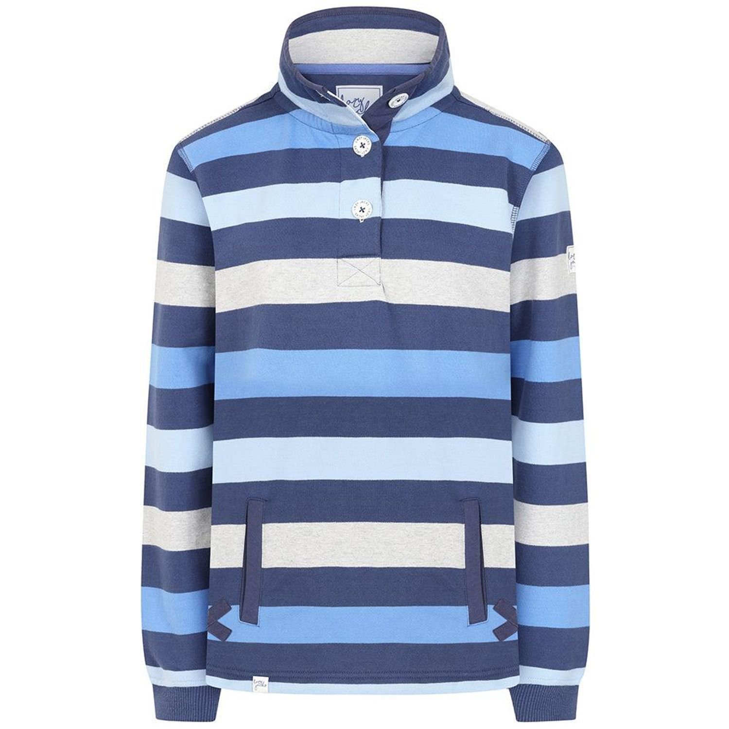 The Lazy Jacks Blue Striped Button Neck Sweatshirt is available in sizes 10, 12, 14.