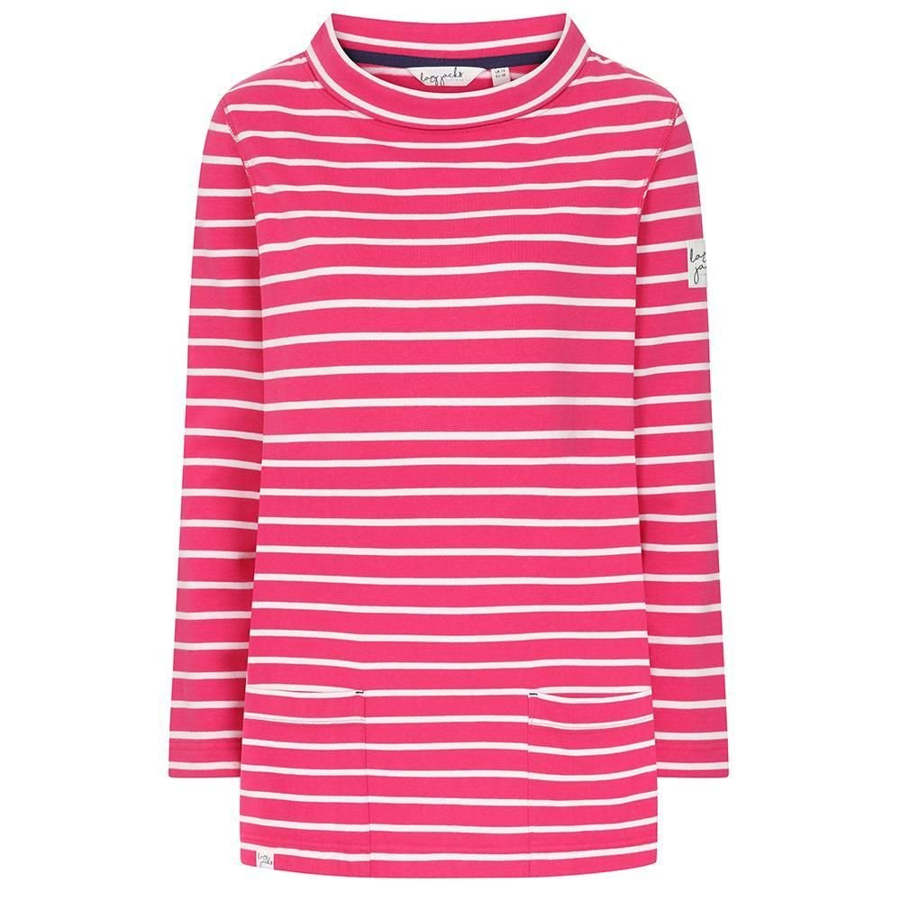 This bright pink roll neck sweatshirt by Lazy Jacks features a striped design and a relaxed fit. Made from 100% cotton, it offers a soft touch and is breathable. Ideal for casual wear.