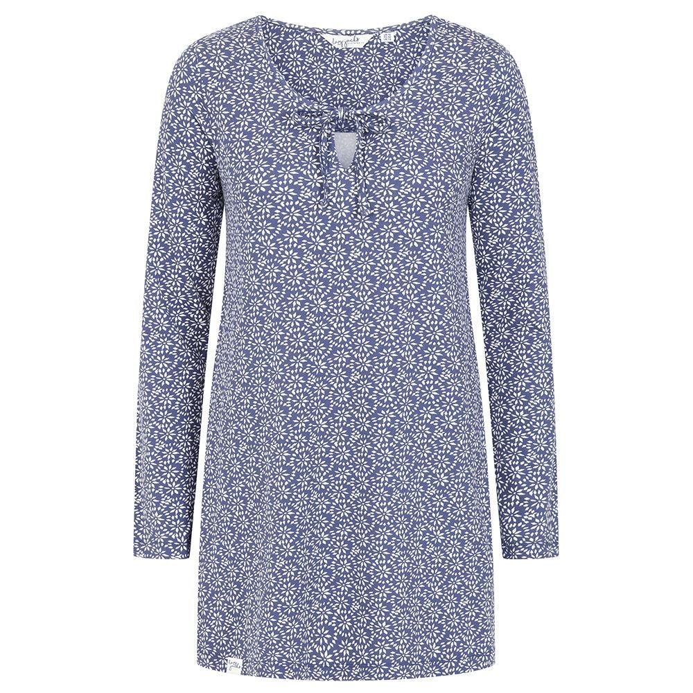 Stylish long-sleeved tunic top in dark blue with a floral print. Features a notch neckline with a tie neck for adjustable fit. Made from 100% cotton for comfort and breathability.
