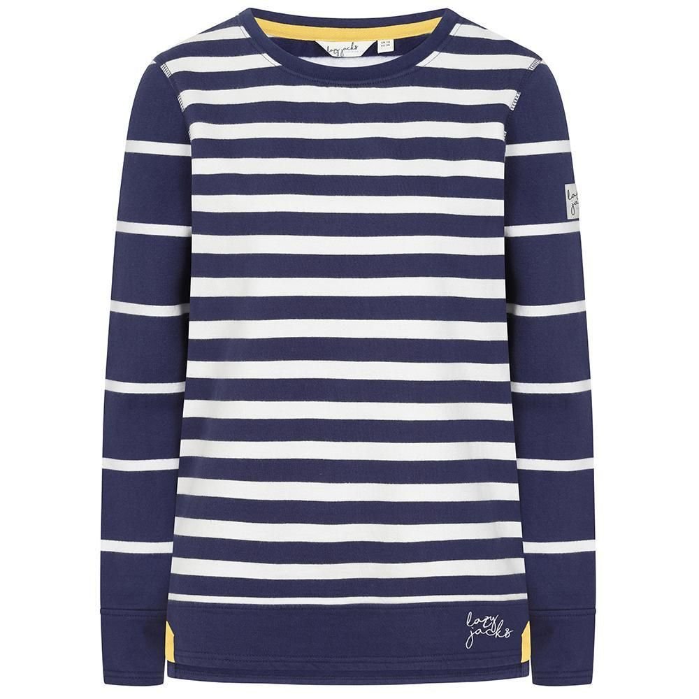 The Lazy Jacks Dark Blue Striped Crew Neck Sweatshirt is available in sizes 8.
