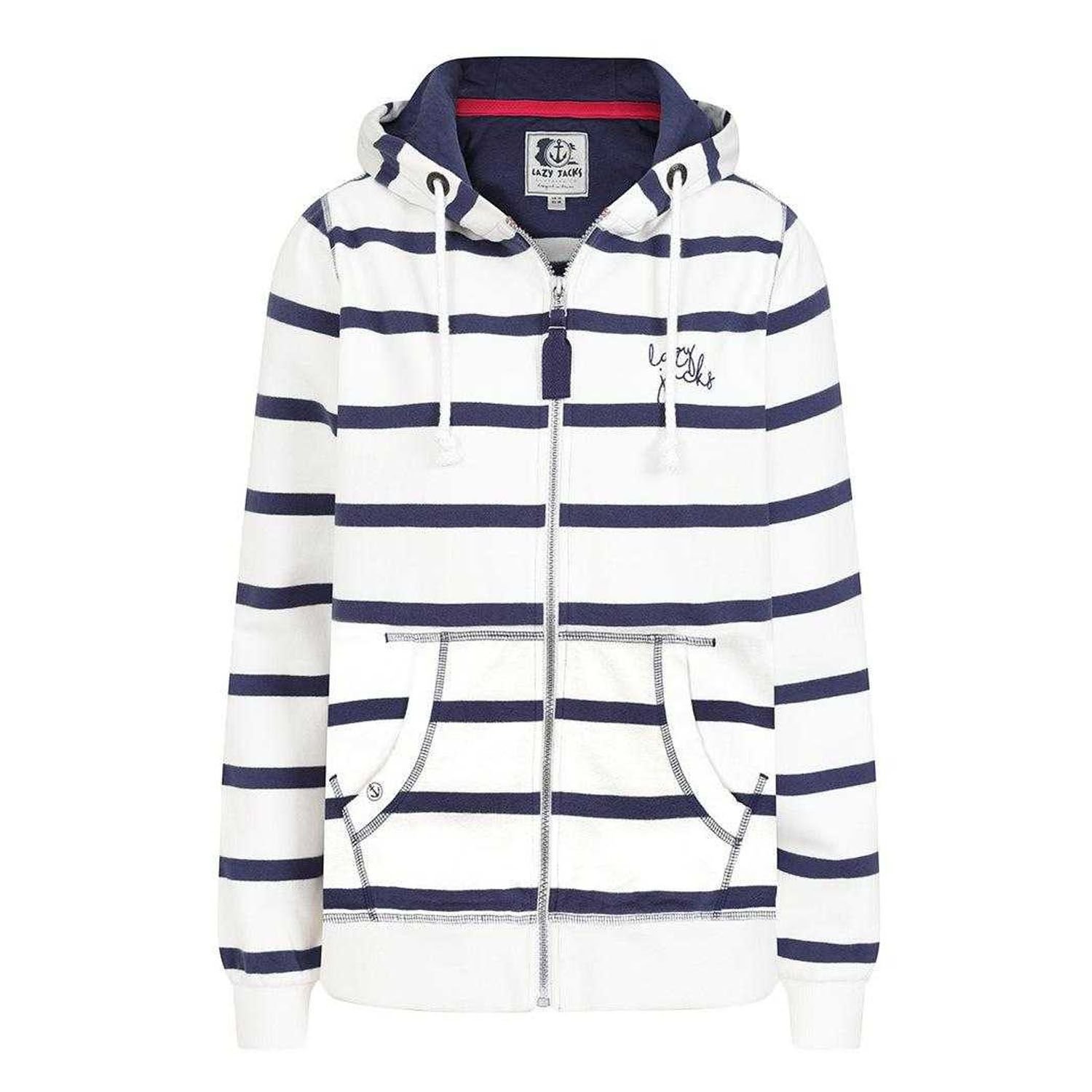 This Lazy Jacks hoodie is crafted from 100% cotton for a soft touch. It features a striped design with a full zip fastening, drawstring hood, and fitted hem and cuffs. Ideal for casual wear.