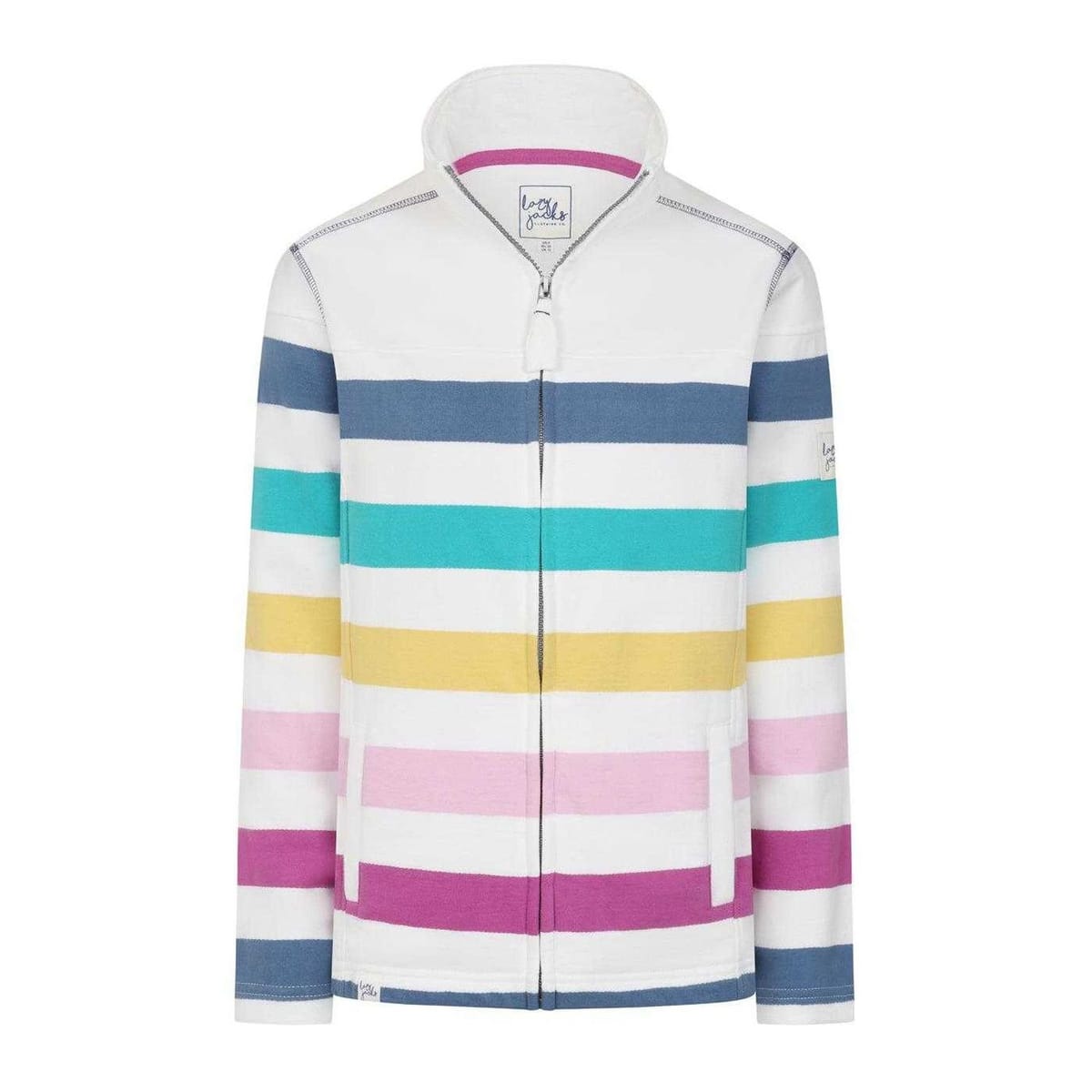This multicolor striped sweatshirt by Lazy Jacks is made from 100% cotton and features a full zip fastening, standing collar, and embroidered logo. Perfect for casual wear with its colour block design.