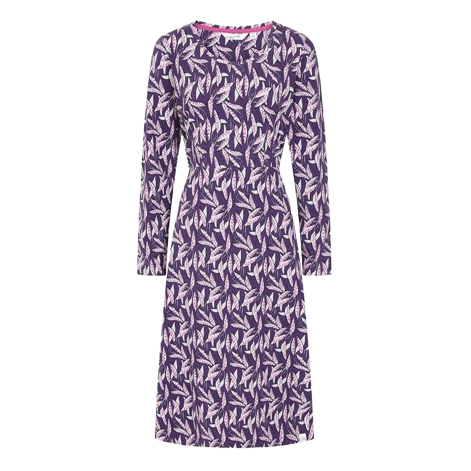 This Lazy Jacks midi dress features a printed leaf pattern in purple. Made from 96% cotton and 4% elastane, it offers a stretchy and comfortable fit. Ideal for casual outings or day-to-night wear.
