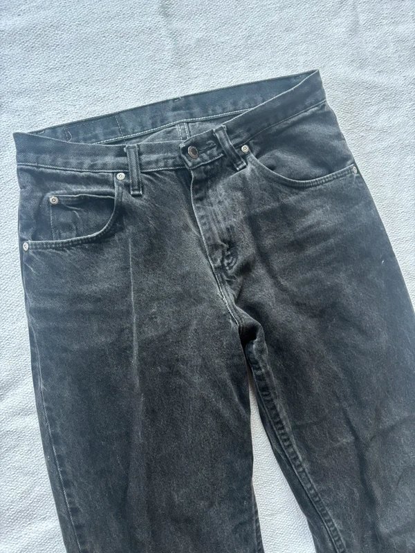 Crafted from charcoal grey denim, these straight-leg vintage Wrangler jeans come with a true vintage fit, perfect for a UK size 10-12. The faded wash adds to the casual charm of these everyday jeans.