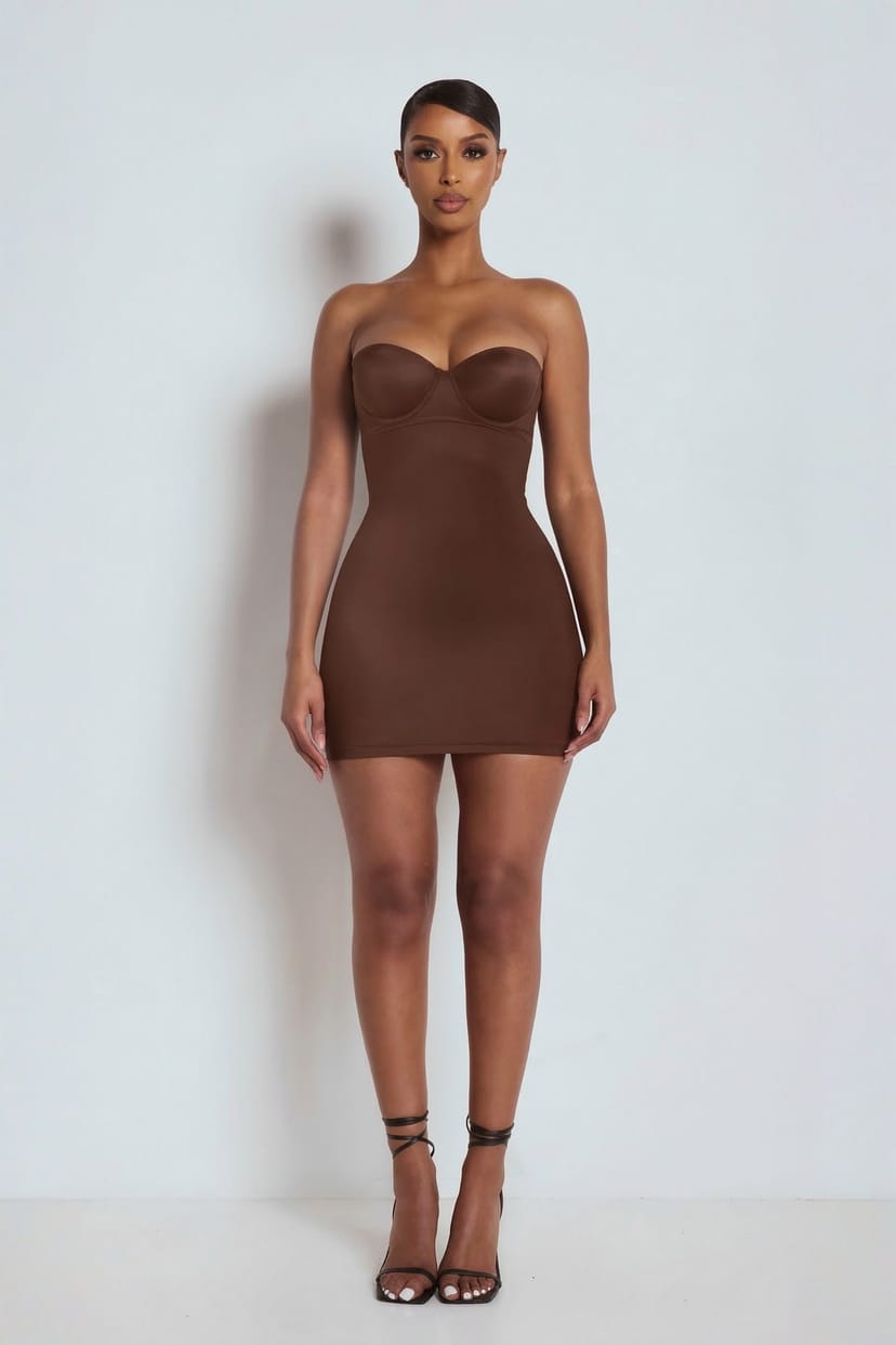 Elegant brown stretch mini dress with a flattering sculpting fit. Features a bandeau neckline and seamless construction for a sleek, second-skin look. Ideal for evening events or date nights.