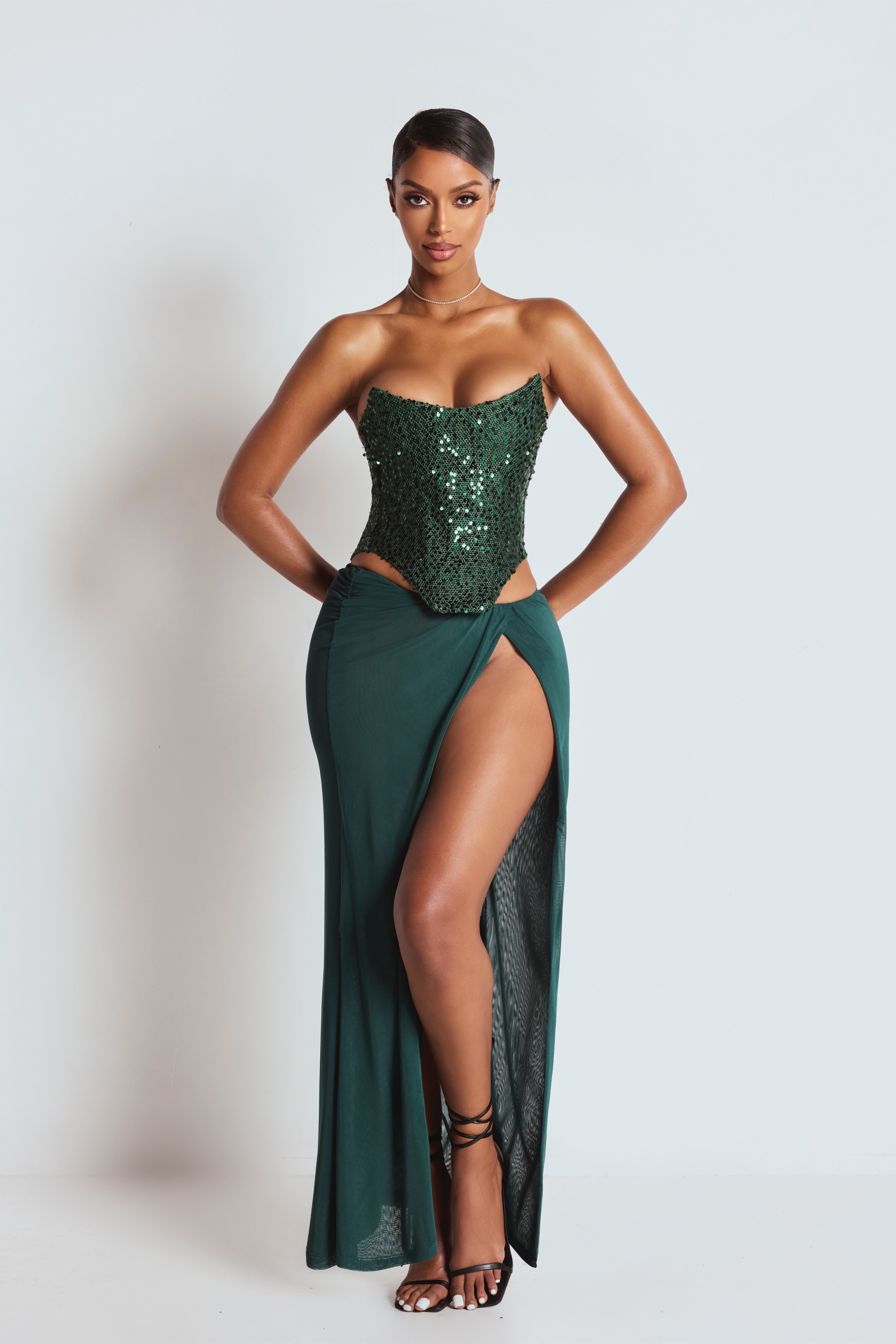 Turn every entrance into a statement with this show-stopping two-piece set, crafted in a luxurious deep emerald green that flatters every skin tone. Designed for evenings where confidence is the dress code, this set combines sculpting structure with fluid elegance.