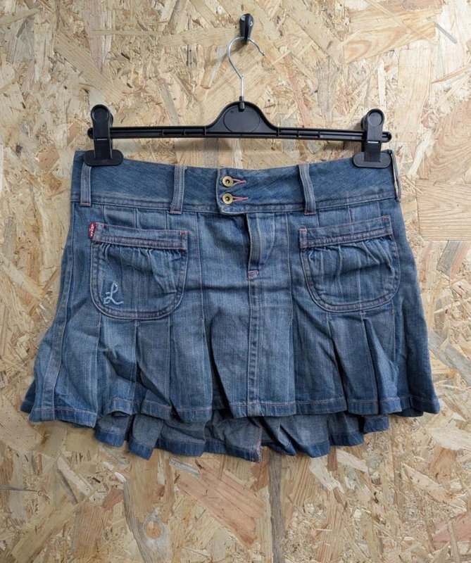 This Levi denim mini skirt is perfect for casual days. Featuring a pleated design and a Y2K aesthetic, it adds a touch of retro charm to your outfit.