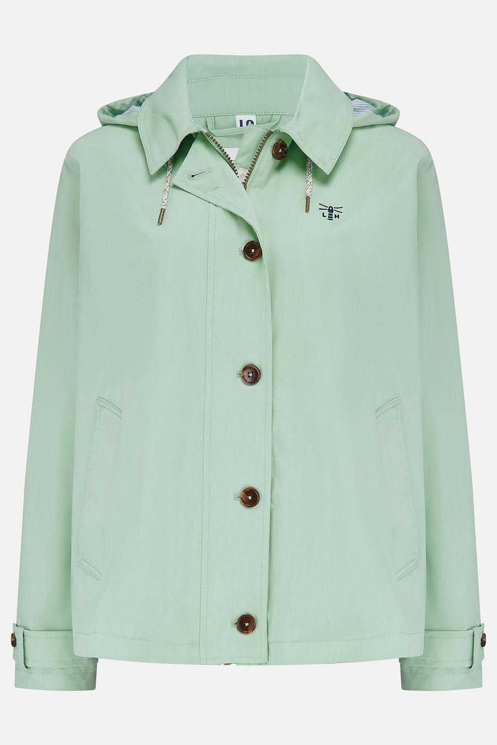 Stylish Lighthouse Clothing Blair Coat in light green. This waterproof and windproof jacket features a classic silhouette with a 5,000mm waterproof rating and fully taped seams. Ideal for unpredictable weather, it combines style with reliable protection.