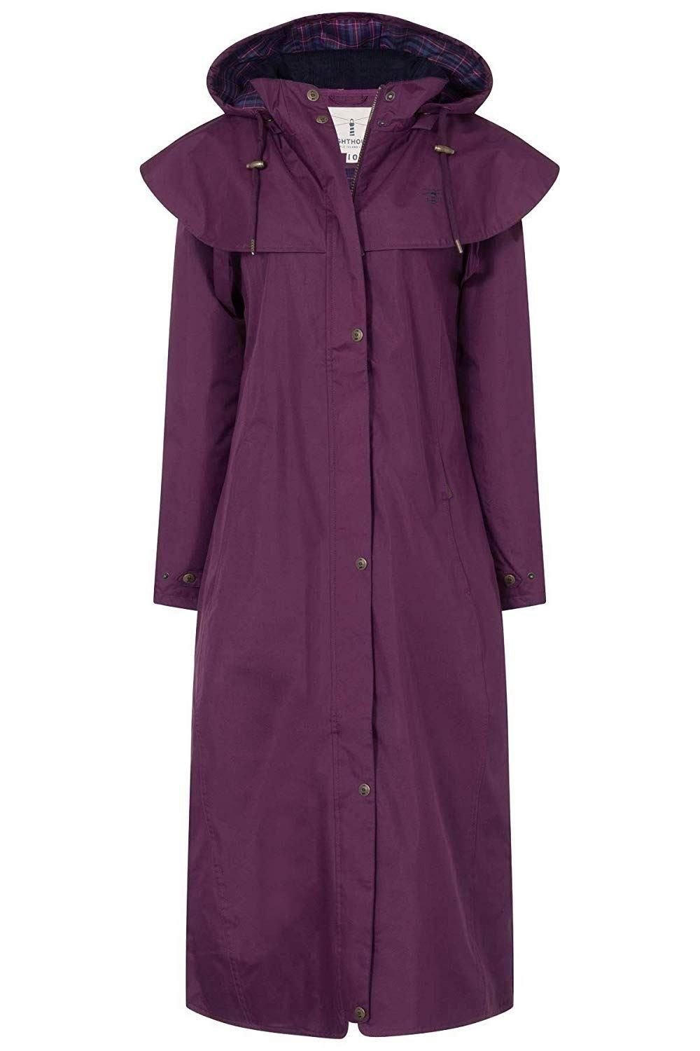 Stylish full-length raincoat in purple from Lighthouse Clothing. Features a detachable hood, walking leg straps, and cape for added protection. Ideal for outdoor activities.