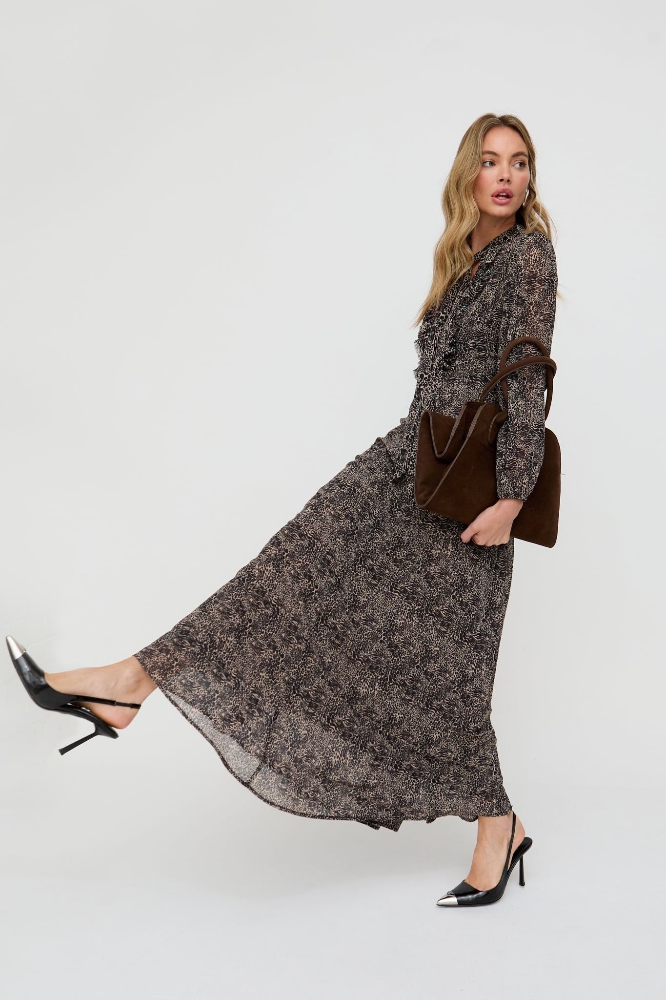 Wildly elegant, the Margot maxi dress is adorned with a mini leopard print in warm brown tones. Featuring a ruffled neckline with a pussybow tie and a detachable slip, it offers the perfect balance of statement style and timeless femininity.