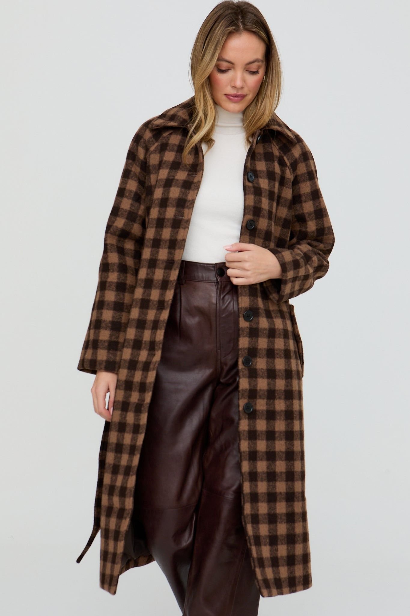 A classic yet contemporary coat in a timeless brown check print. It features a longline tailored cut and fastens with a waist tie for a cinched or loose fit. Ideal for effortless layering.