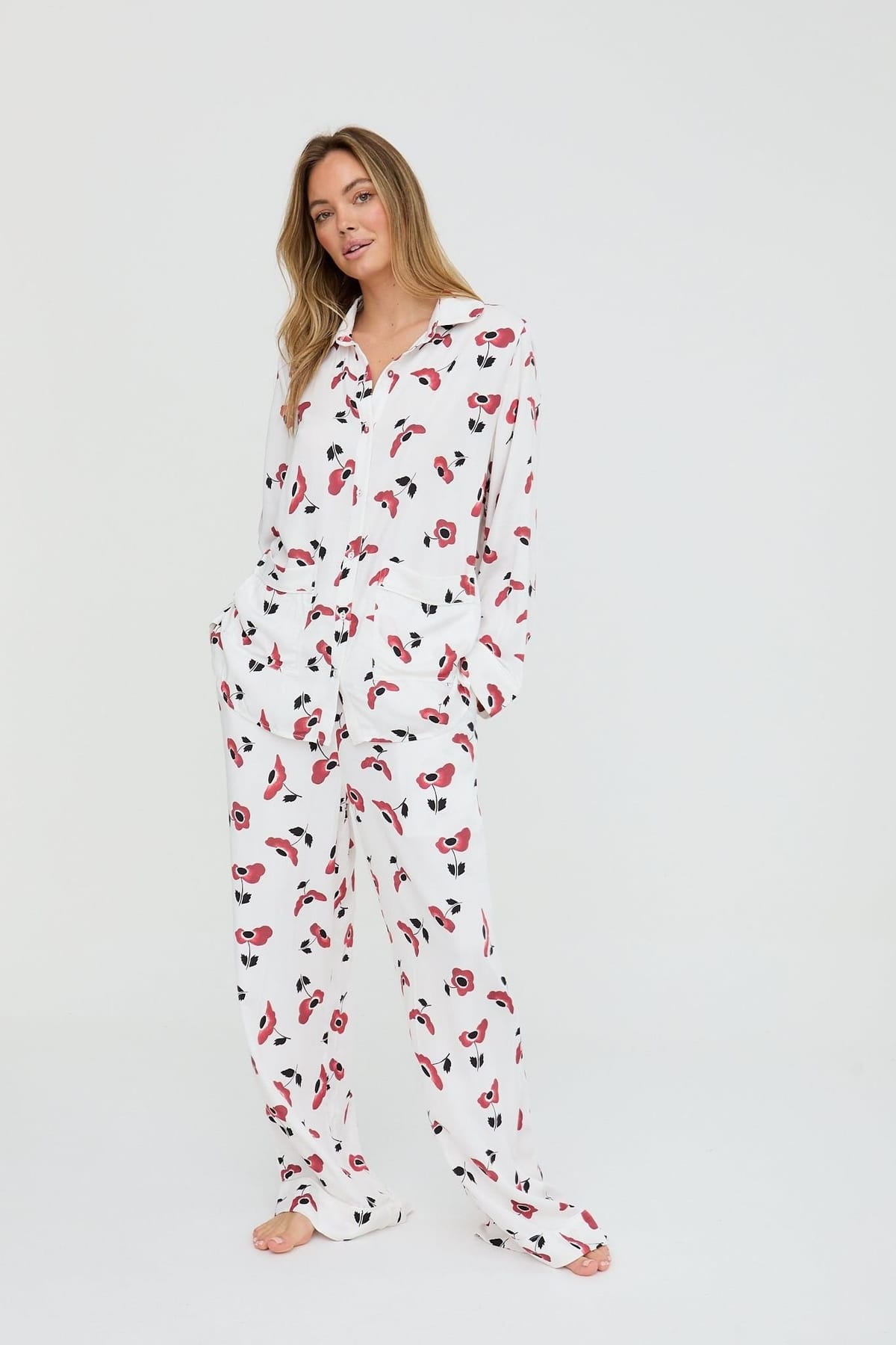 Fresh and uplifting, the Evie pyjama set blooms in our painterly Poppy print on a soft cream base. The classic button-down shirt is detailed with piping on the front patch pockets, while the drawstring-tie, wide-leg trousers bring effortless elegance to your lounge-to-sleep ritual.