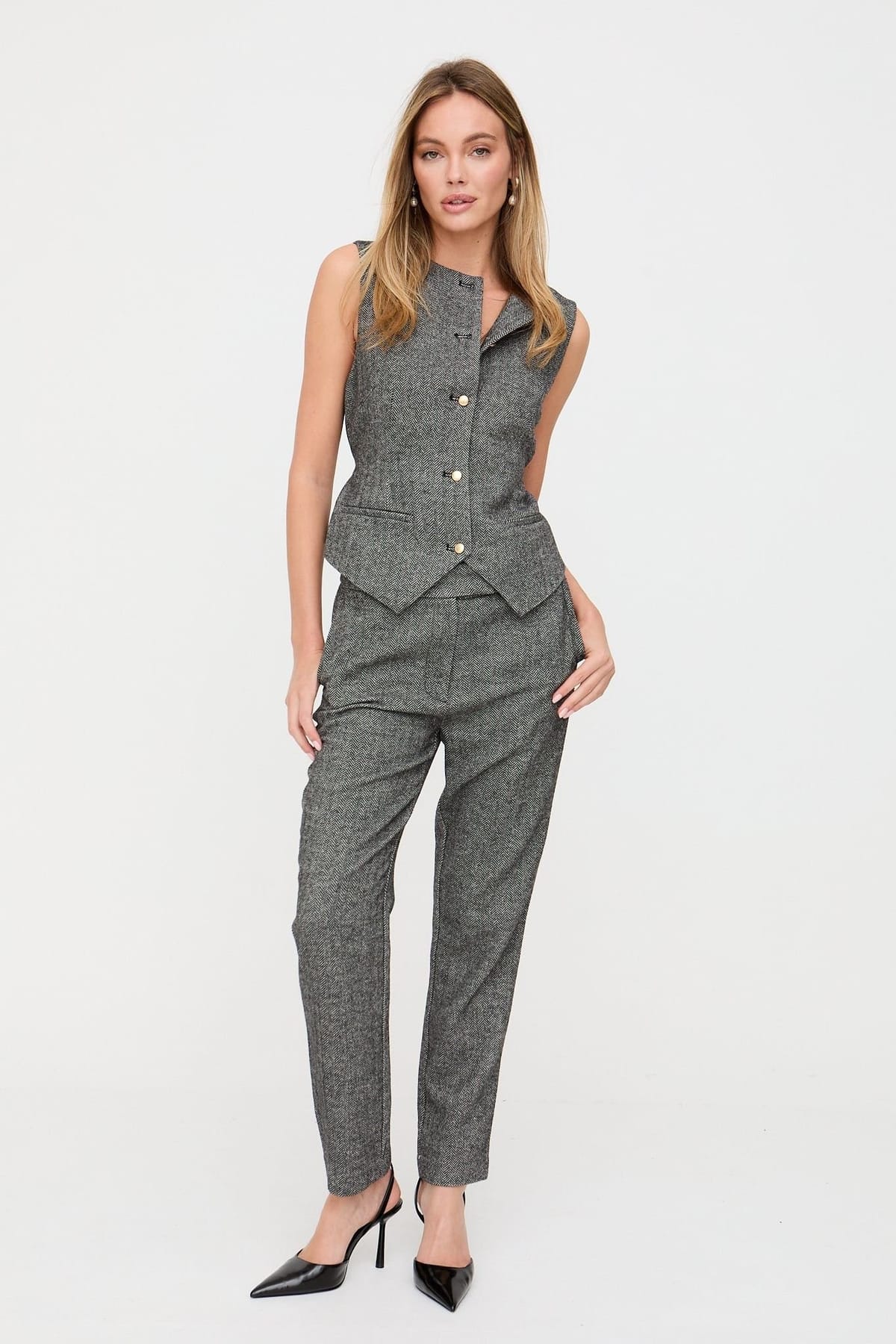 The Lily and Lionel Grey Herringbone Print Wool Blend Trouser is available in sizes 12, 14.