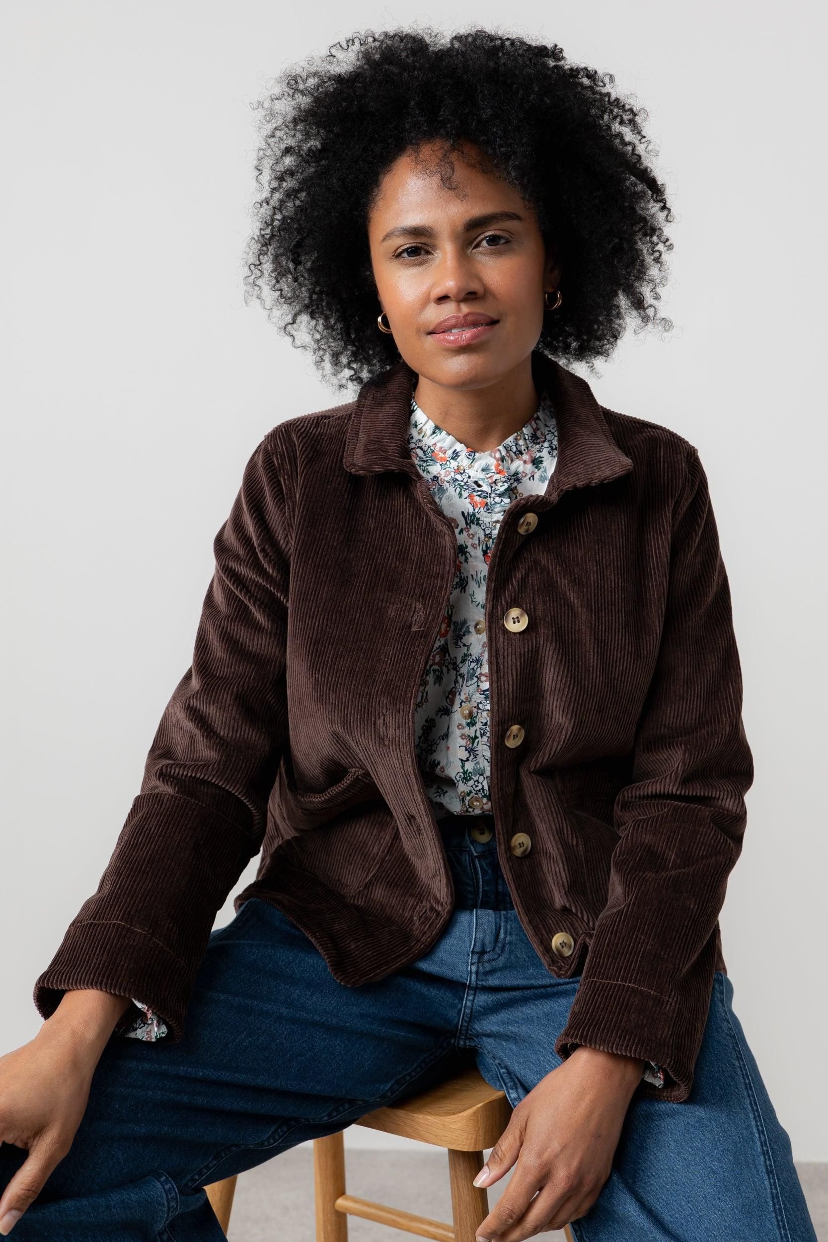 The Lily & Me Chocolate Stretch Corduroy Jacket with Printed Lining is ideal for casual, everyday, outings.