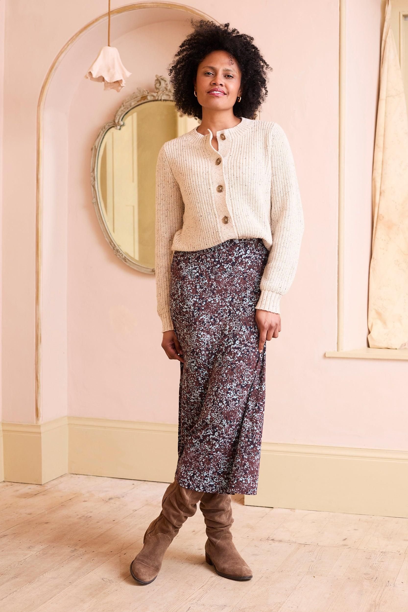 Versatile midi skirt in chocolate floral print with an elasticated back waist. Made from soft viscose/elastane fabric, perfect for layering with tights and boots.
