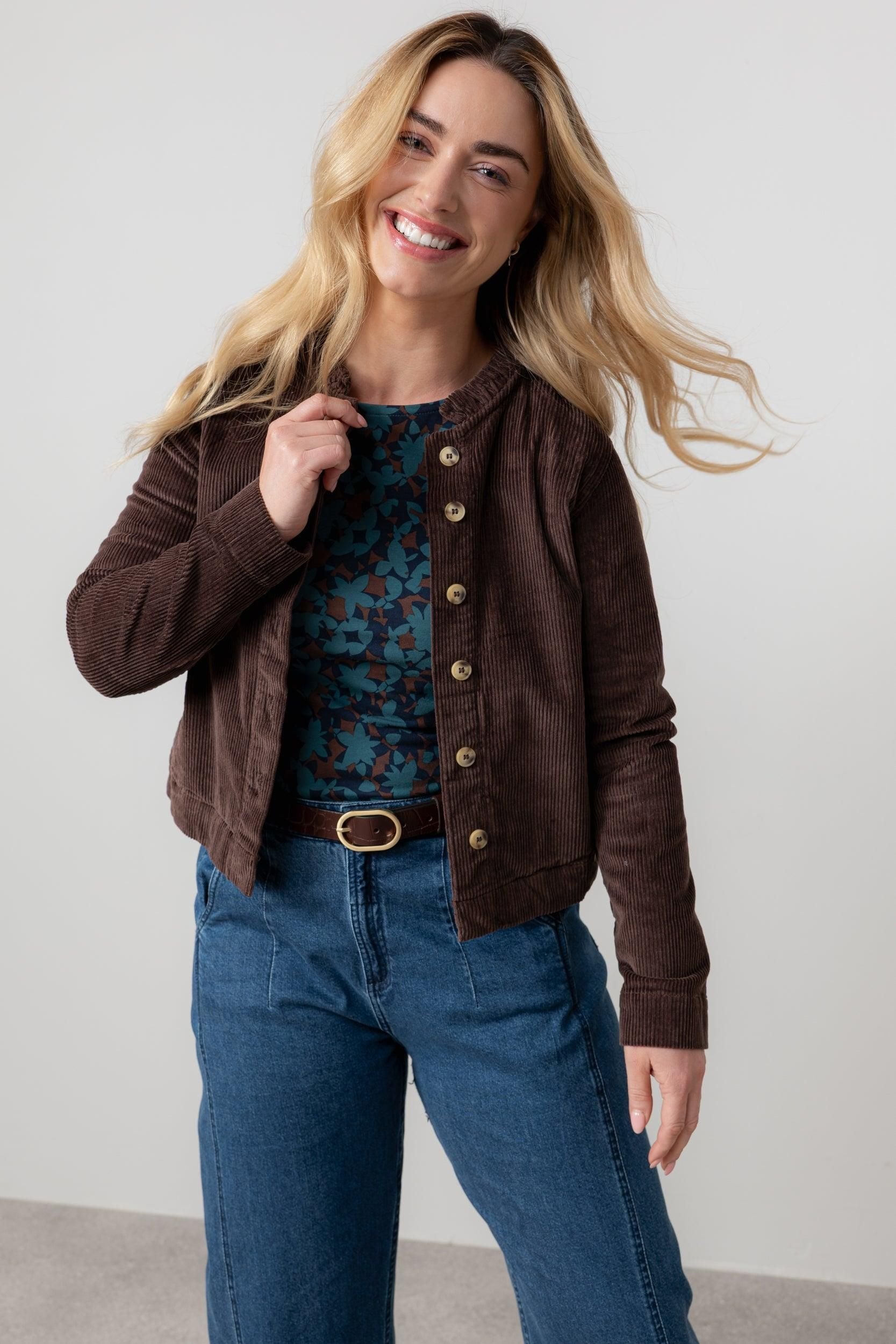 Stylish chocolate stretch cord jacket with a scalloped collar and utility-inspired front patch pockets. Made from soft, tactile jumbo cord with a touch of elastane for added stretch and comfort.