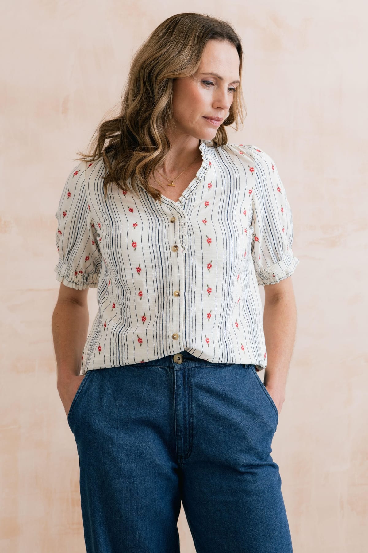 Charming Lily & Me Wren Frill Blouse in ecru with embroidered floral stripes. Features a scalloped collar, full button-down front, and short sleeves with half-shirred cuffs. Ideal for a feminine and elegant look.