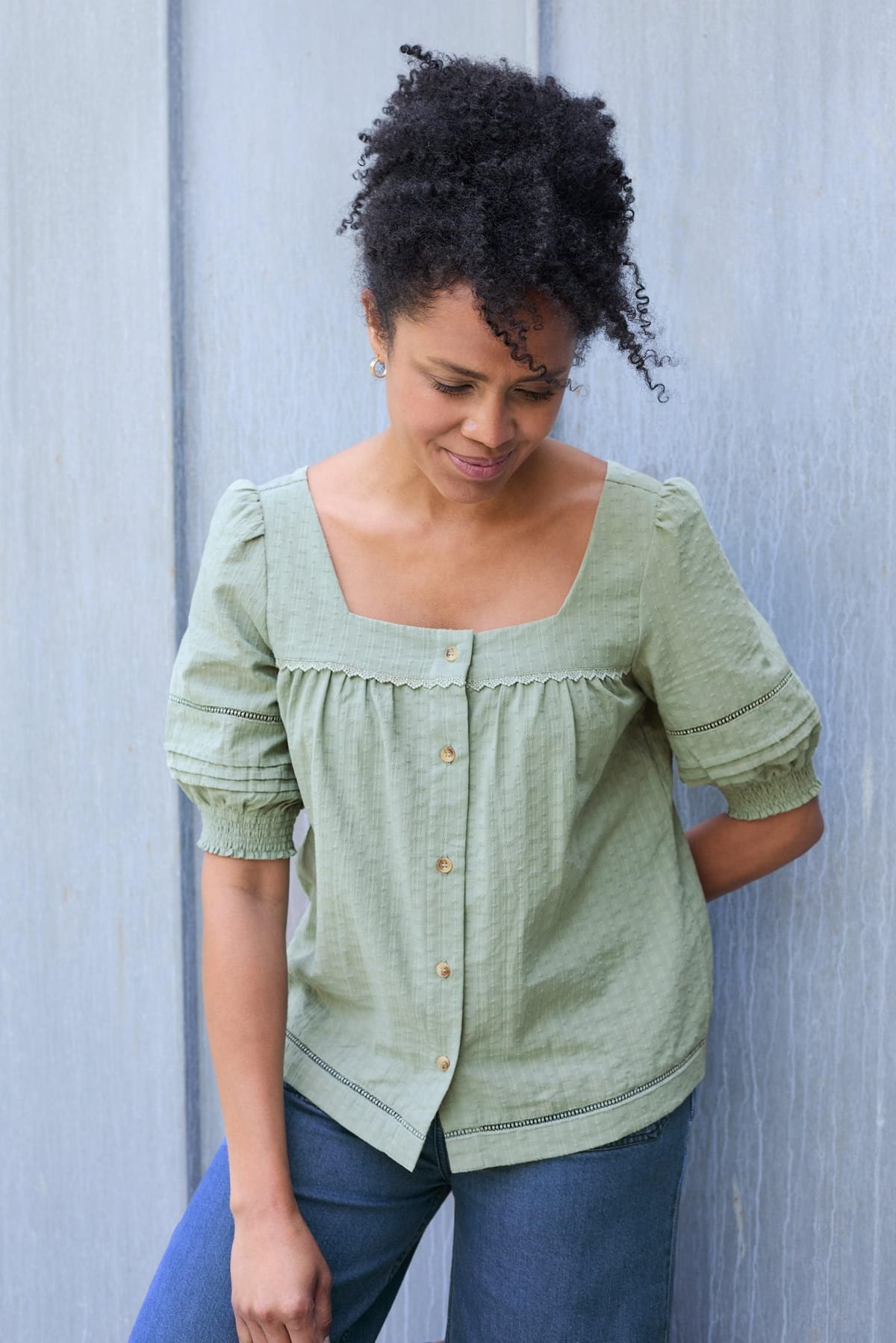 Charming Lily & Me blouse in green cotton with a textured woven self stripe and pointelle detailing. Features a squared neckline with gathers at the bust and 3/4 length puff sleeves with shoulder gathering. Adorned with pretty inserted cotton lace trim.