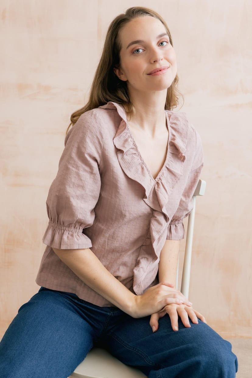 See all outfit ideasCharming pink cotton blouse with a romantic, playful vibe. Features a woven self stripe and pointelle detailing. The V-neckline has feminine frill detailing around the neck and three-quarter sleeves with elasticated frilled cuffs. Perfect for casual and smart-casual occasions.