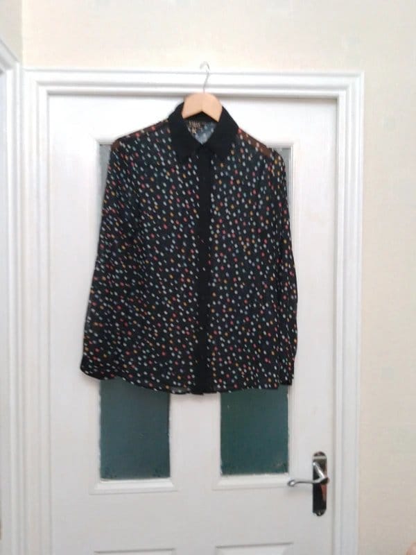 View Vinted's returns policyThis jet black chiffon blouse by Lipsy features a long sleeved design with a front button fastening. It boasts a ditsy multicoloured spotted print in pastel and rainbow colours, offering excellent quality. Ideal for size 8/10.