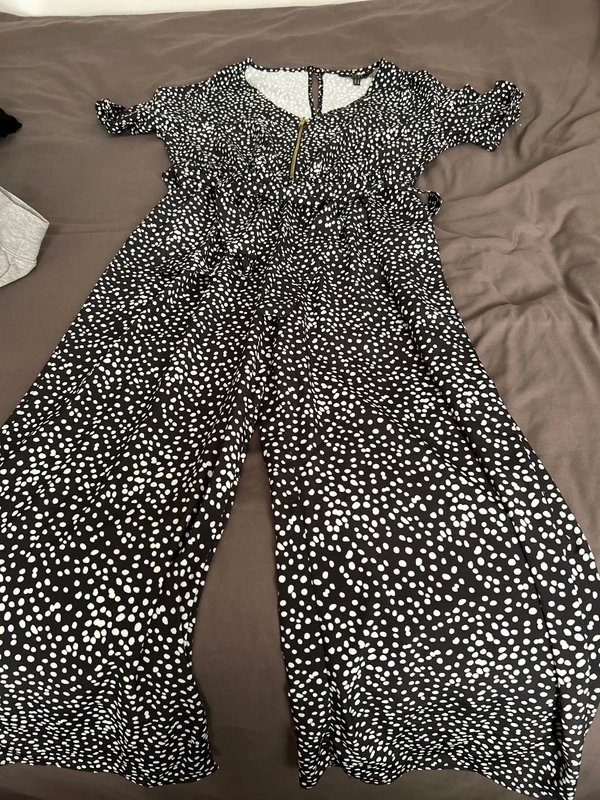 The Lipsy Black Polka Dot Jumpsuit is available in sizes L.