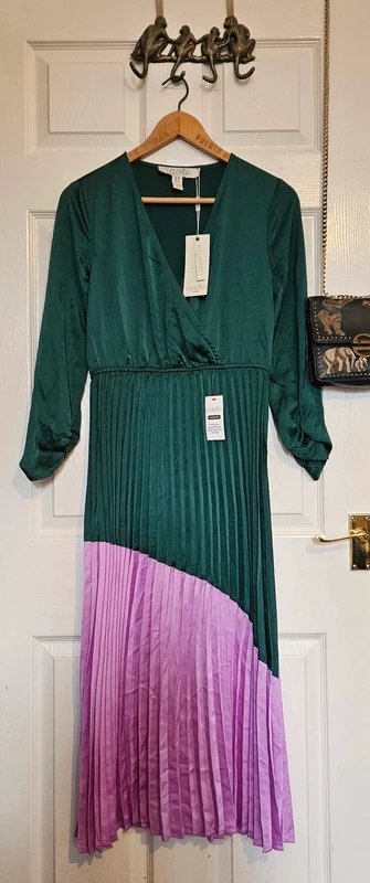 The Liquorish Pleated Midi Dress in Emerald Green and Hot Pink is available in sizes S.