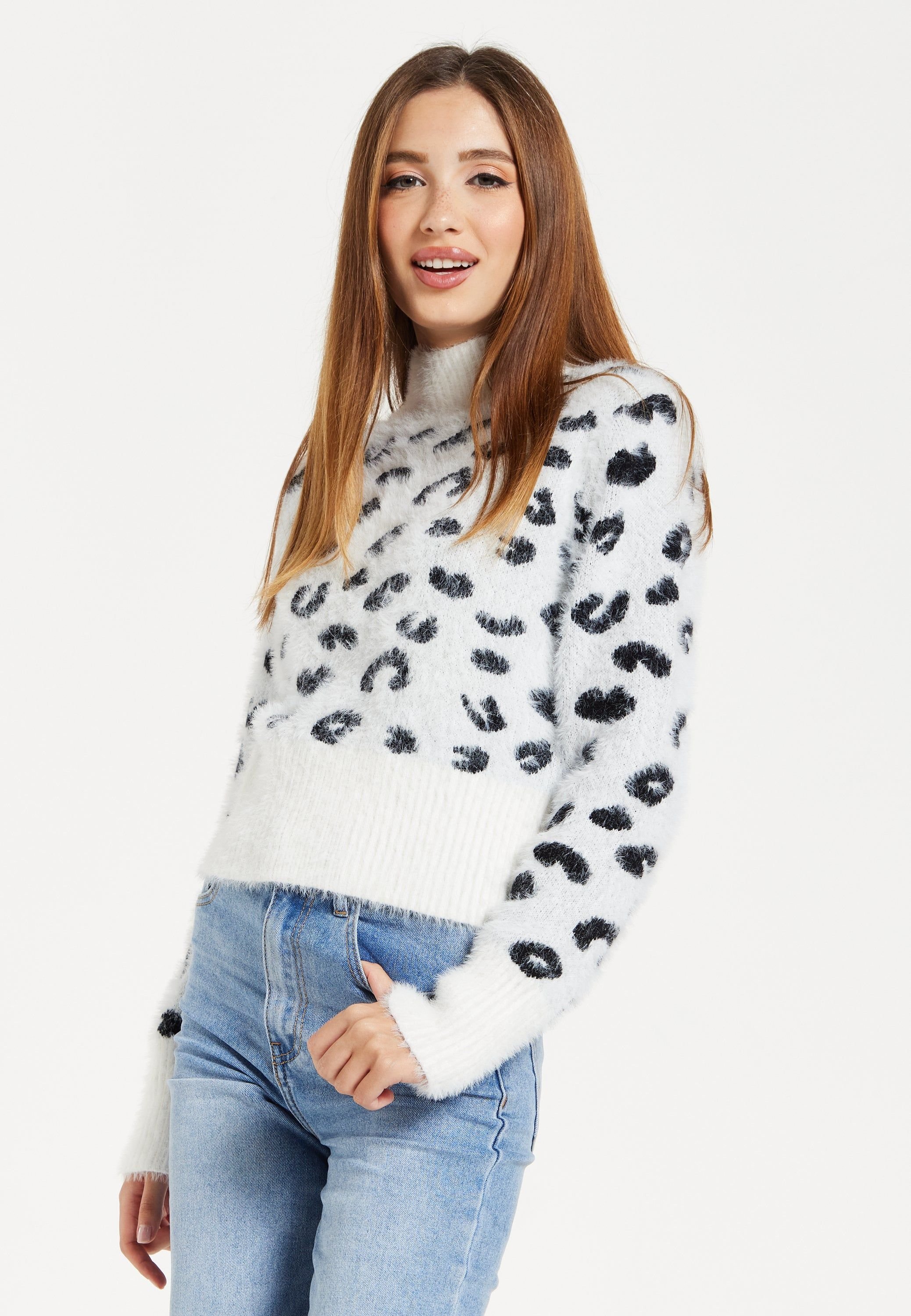 Playful white leopard print jumper with a soft base and bold black spots. Designed with a cosy high neckline and a relaxed fit for comfort and style.