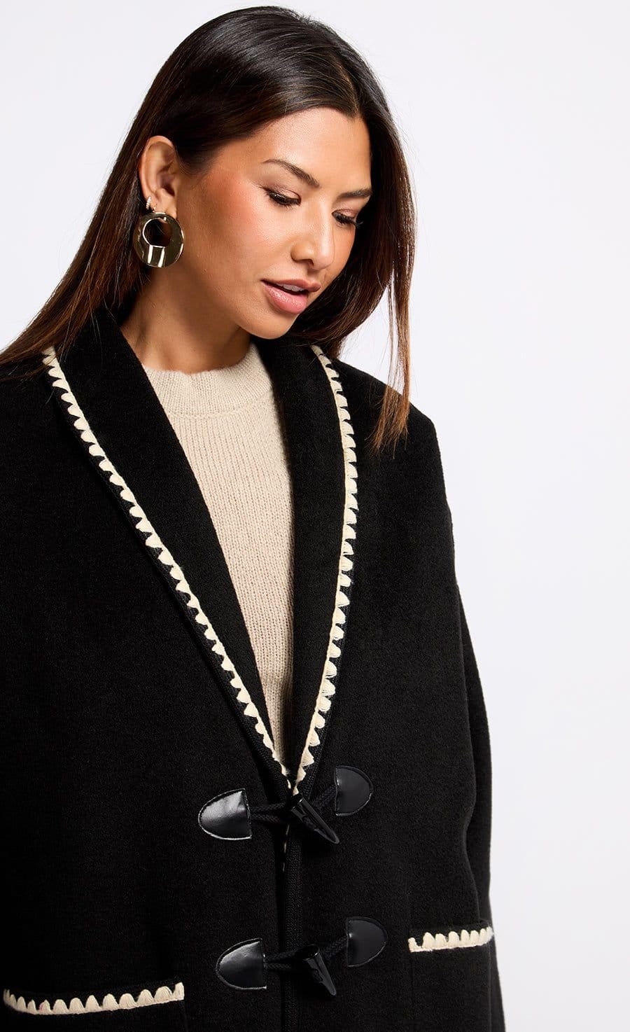 Elegant black jacket with a relaxed fit, featuring a V-neckline and contrast cream trims. Ideal for a cosy yet stylish autumnal look.