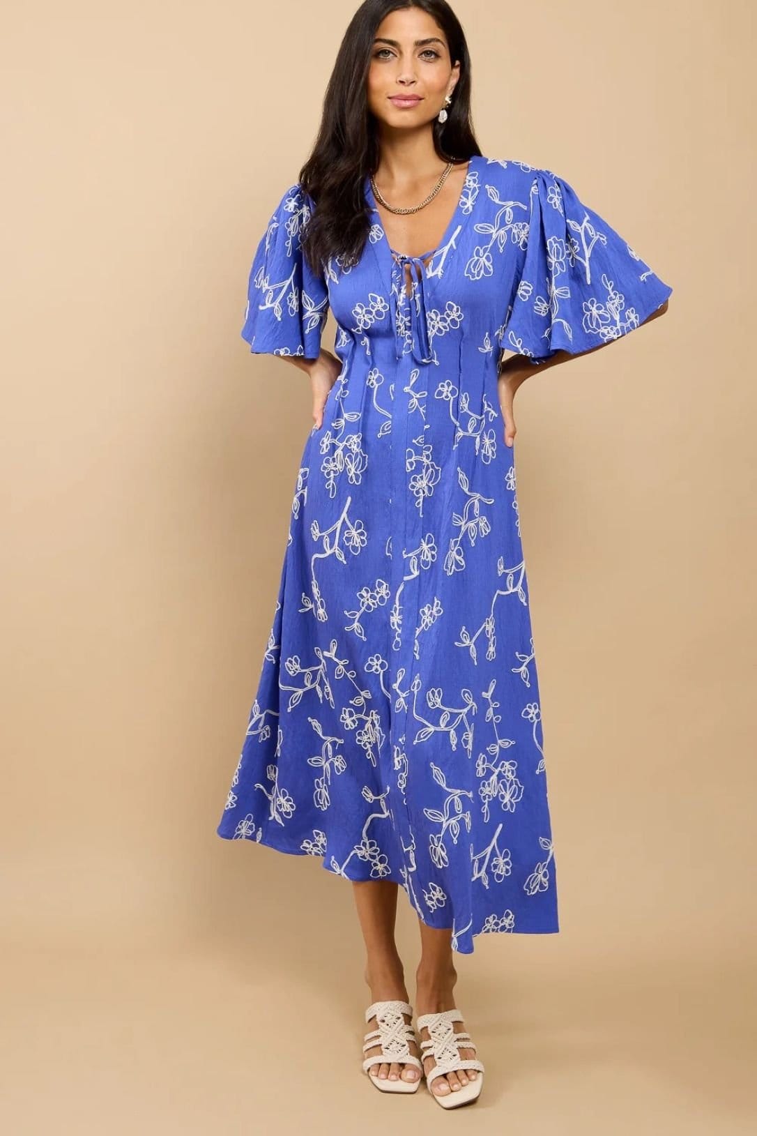 This blue embroidered midaxi dress combines delicate detailing with a flattering a-line shape. Short sleeves and a v-neckline make it ideal for weddings, brunches, or evening gatherings.