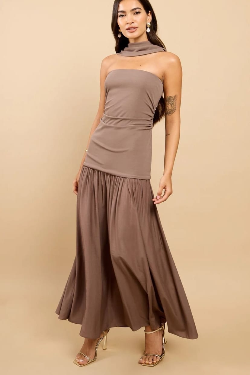Sophisticated bandeau maxi dress in brown featuring a dropped waist and sleeveless a-line cut. Ideal for cocktail parties and evening occasions, this dress offers a timeless elegance.
