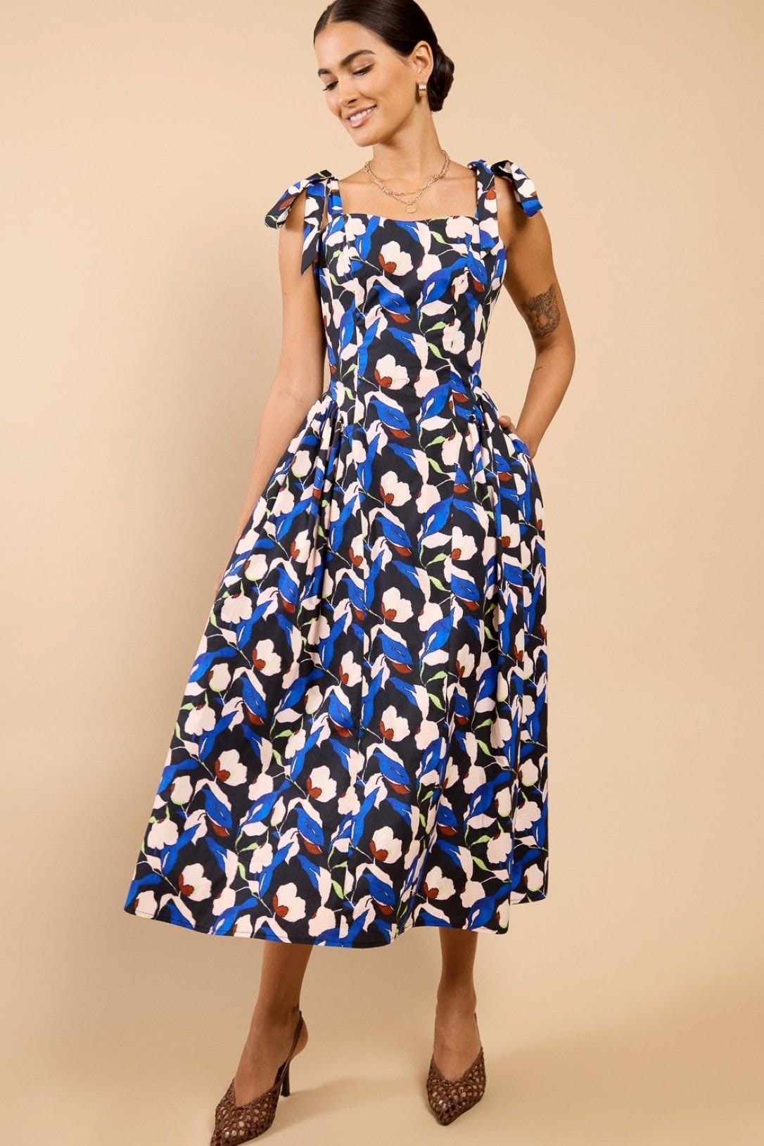 Romantic and feminine, this floral print midi dress is designed with tie straps and a flattering square neckline. The flowing a-line shape makes it perfect for garden parties and summer days.
