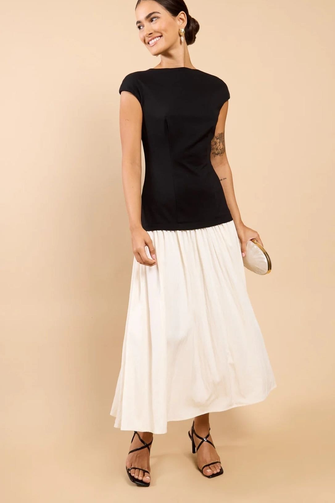 Stylish monochrome maxi dress with a dropped waist and short sleeves. Ideal for formal events and evening dinners. Pair with statement earrings and strappy heels for a chic look.
