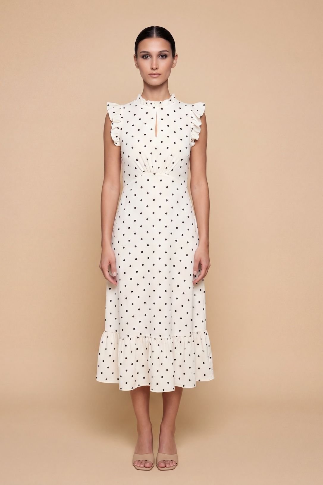 The Little Mistress White Polka Dot Satin Midi Dress is ideal for evening, date-night, party.