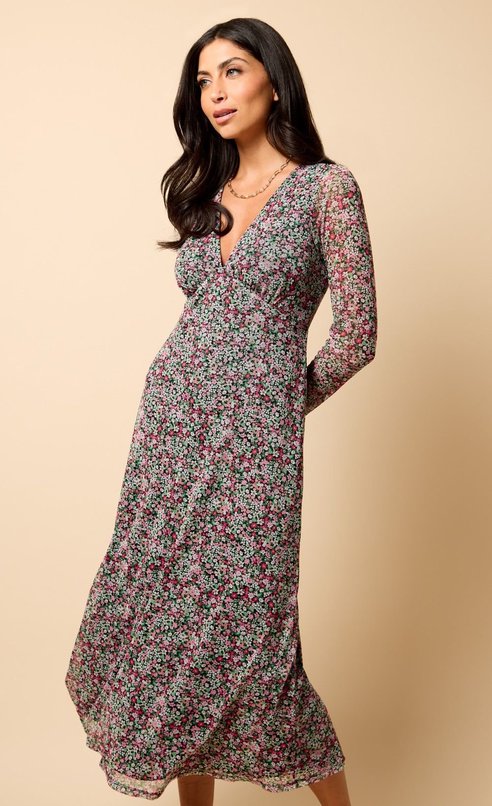 The Little Mistress Floral Print Midi Dress in Multicolor is made from mesh.