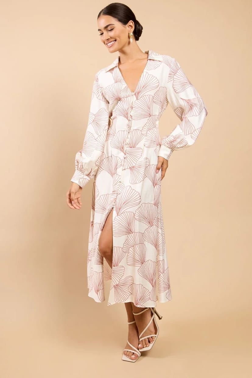 Chic white shell print midaxi shirt dress with long sleeves and a classic collar. Ideal for work events, brunches, or day-to-evening occasions. Complete the look with ankle boots or heels for a polished finish.