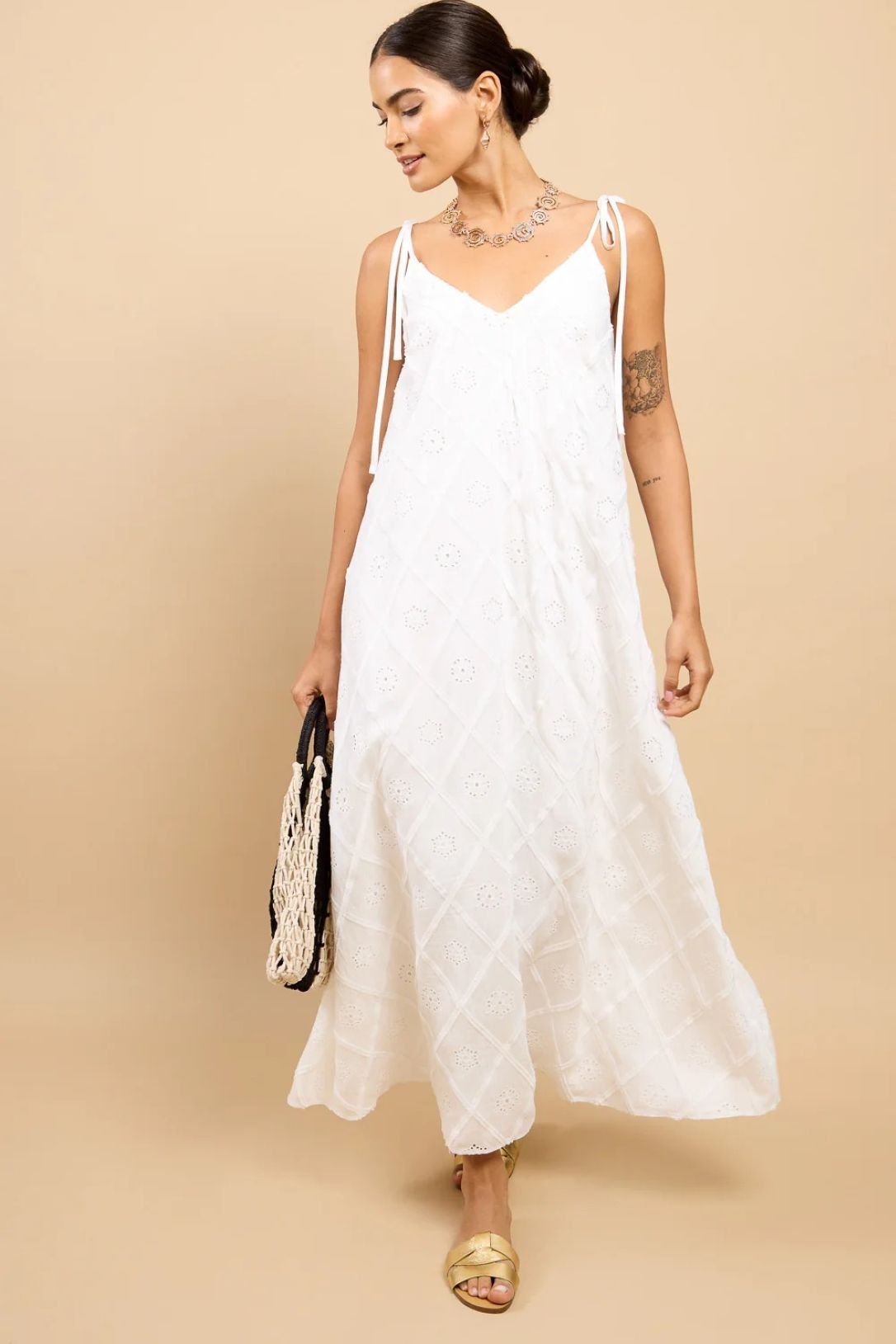 The Little Mistress White Embroidered Maxi Dress is ideal for weddings, garden parties, summer events.