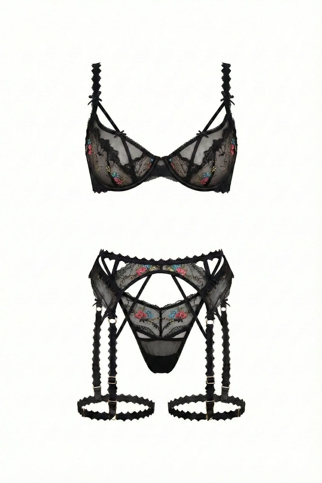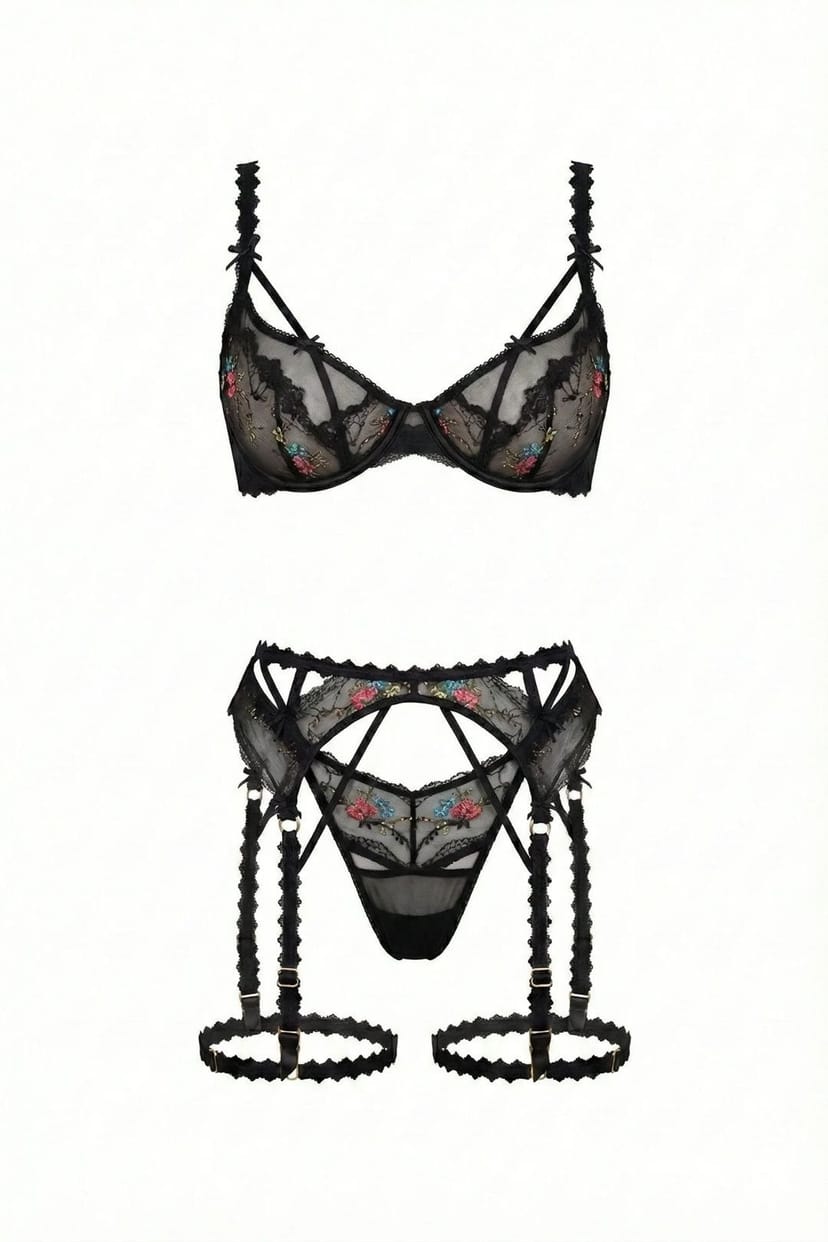 Indulge in timeless allure with the Amber Black Suspender Set, a sultry 3-piece lingerie ensemble designed to captivate. Crafted from a luxurious blend of spandex and polyester mesh, this semi-sheer set features intricate floral lace embroidery and flattering cut-out detailing that celebrates your curves.