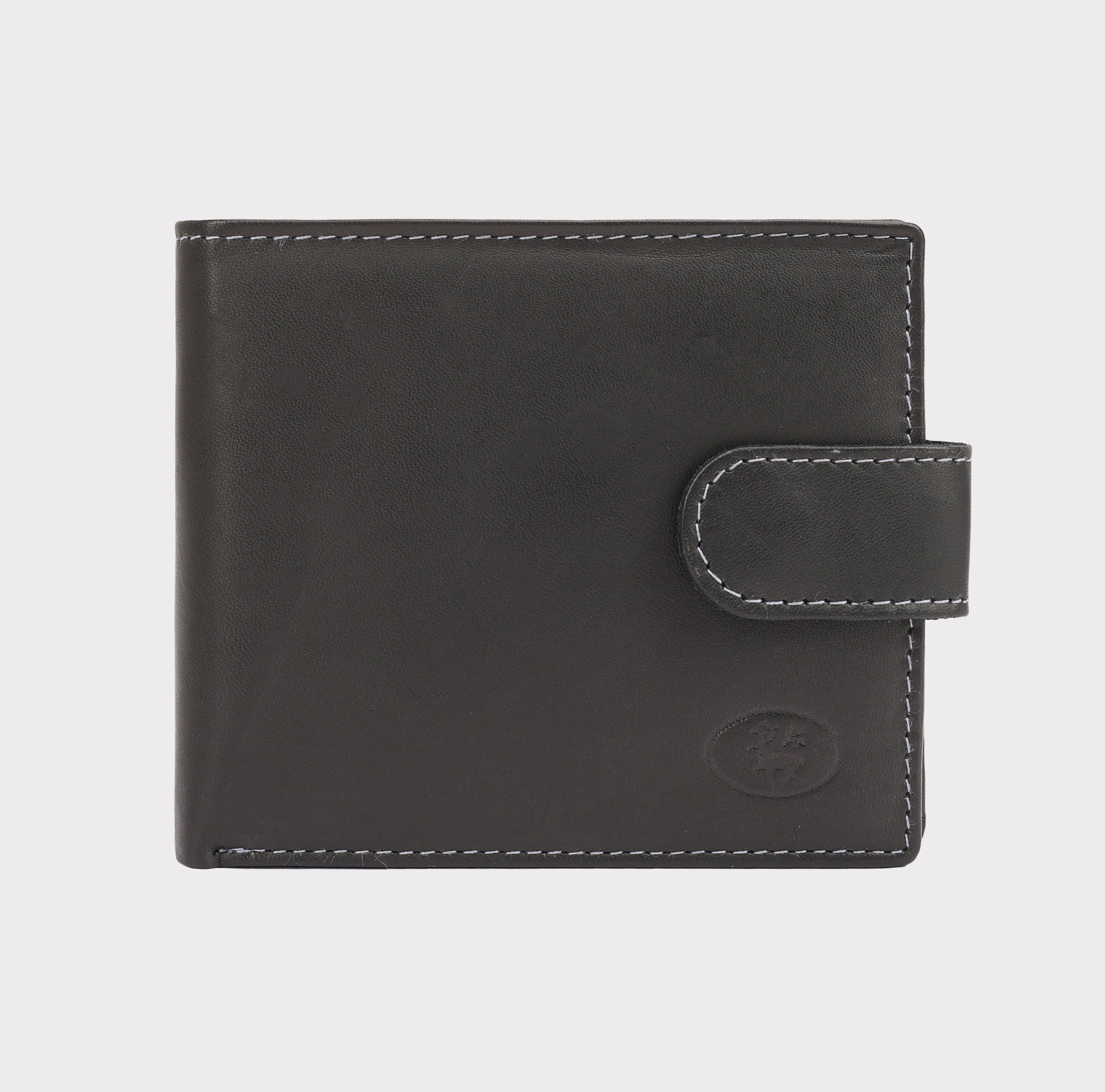 A sleek bifold leather wallet in black, featuring a brand logo embossed on its front. This practical accessory includes two full-size note sections, three card slots, and a secure coin pocket, all fastened neatly with a tab closure.
