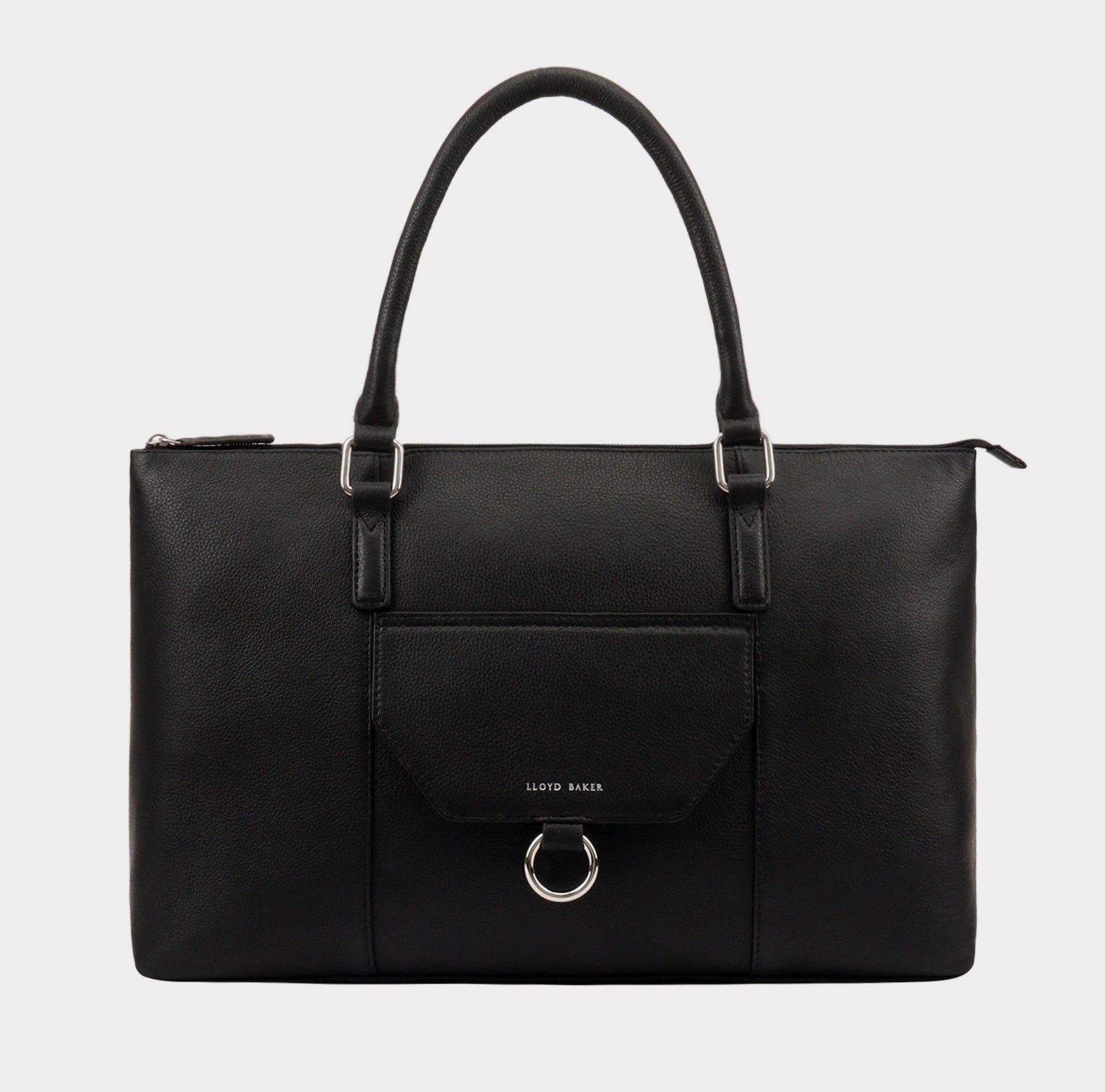 Stylish black leather shoulder bag from Lloyd Baker. Features a secured top zip, slip-in front pocket, sturdy handles, and a spacious interior. Perfect for everyday use.