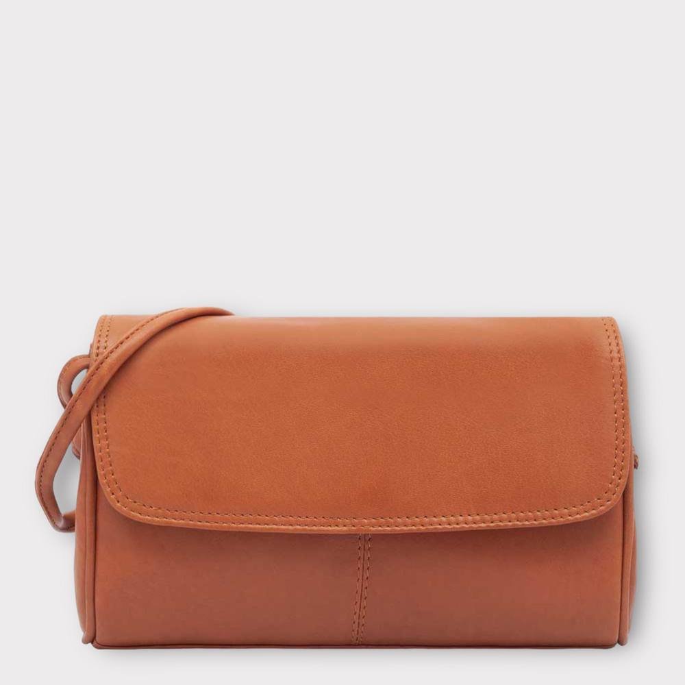 Stylish brown leather crossbody bag with a well-organized interior featuring two zipped pockets and a slip pocket for quick access to essentials. The back has an additional zipped pocket. Comes with a slender, stylish shoulder strap.