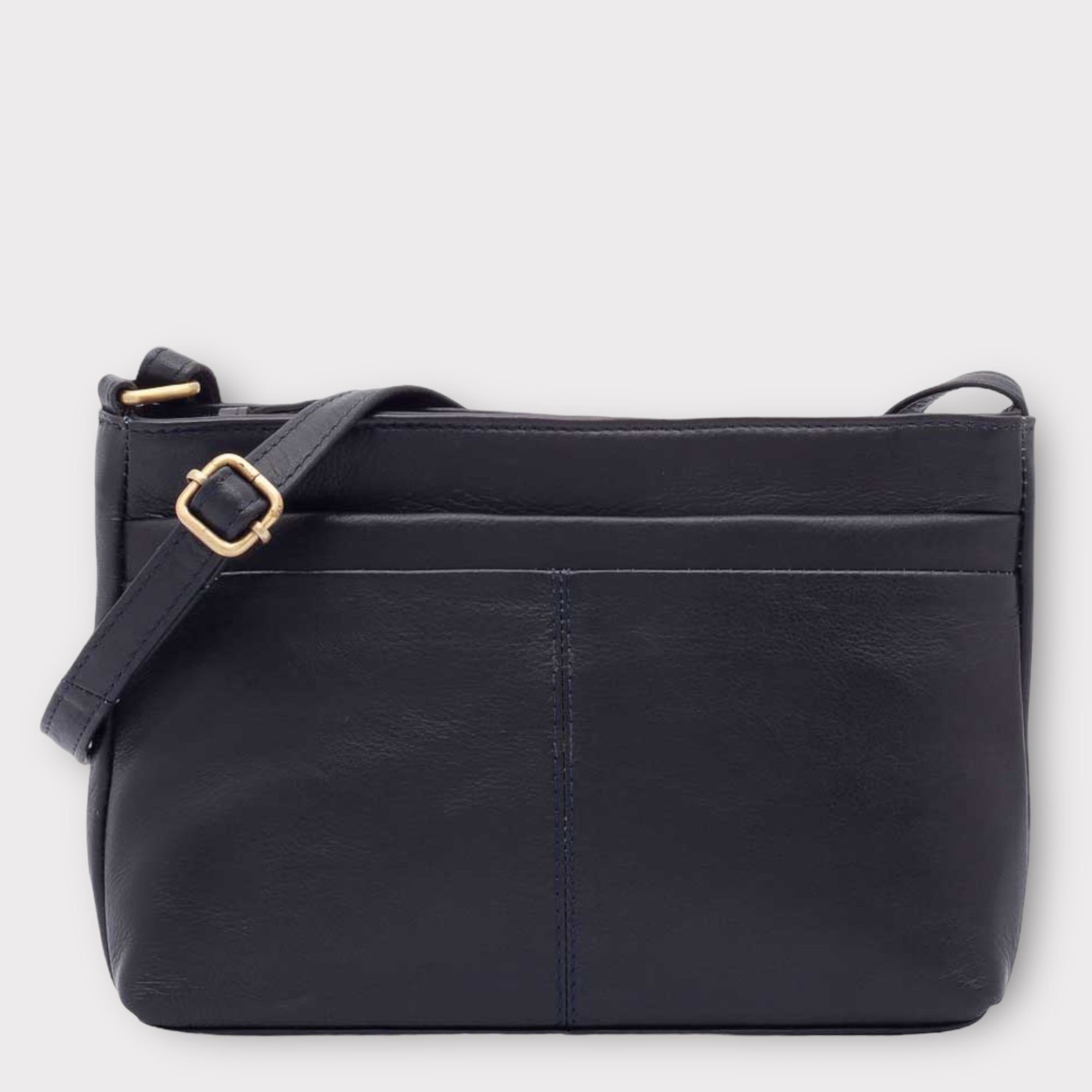 Sleek Navy leather crossbody bag with two zipped front compartments and a secure back pocket. Ideal for everyday use, offering organization and quick access to essentials.